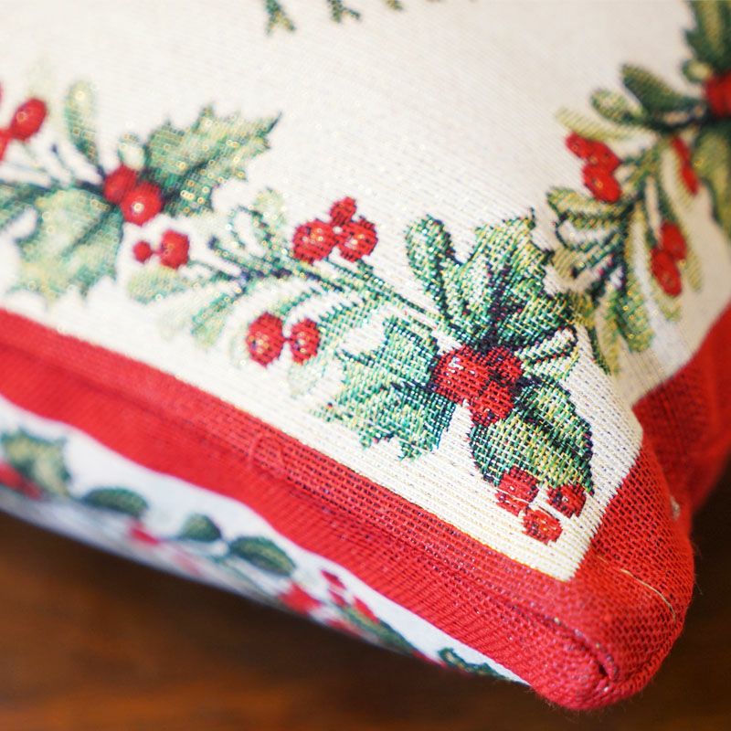 【コメント】ポルトガル製のゴブラン織りを使用したポインセチア柄のかわいいクッションカバーです。ソファの上に飾るだけでリビングが華やかになり楽しい空間になります。ギフト・プレゼントにも最適です。