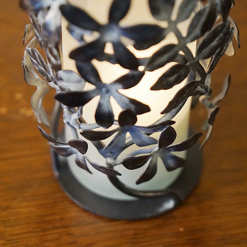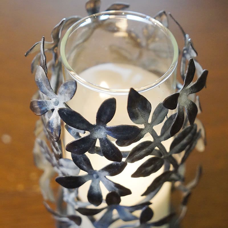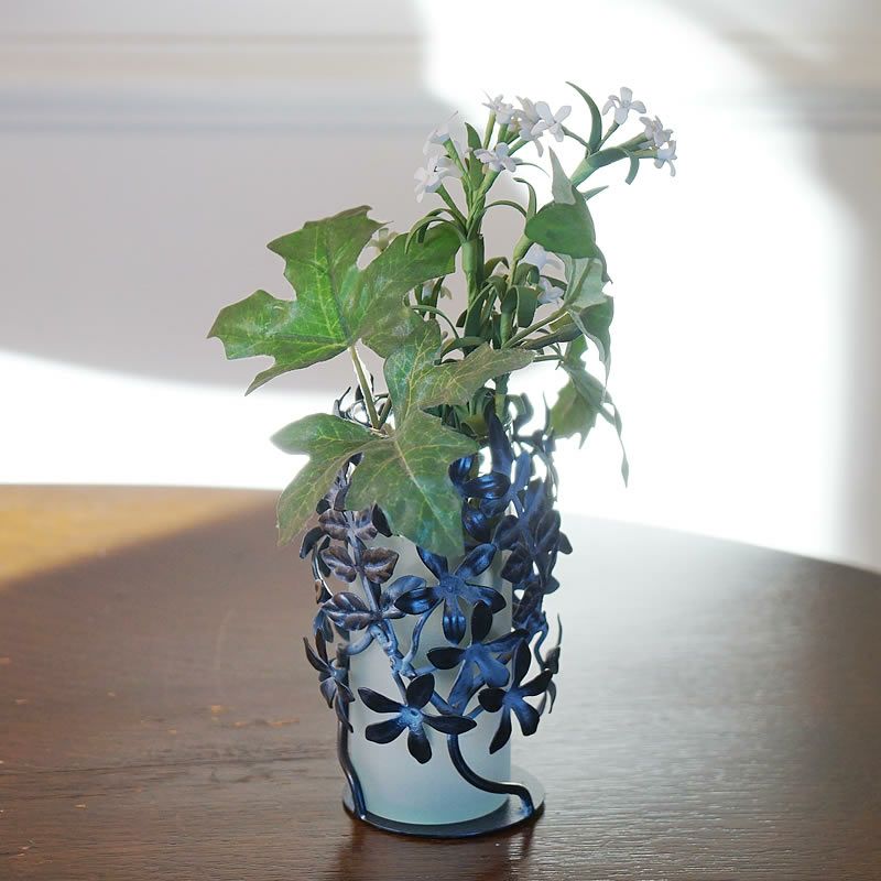 【コメント】ジャスミンの花をモチーフにしたアイアンの花瓶です。フレームはアイアンで花瓶はスモーク仕上げのガラスになります。スモークなので、キャンドルホルダーとしてもご利用いただけます。プレゼントにもおしゃれなアイテムです。