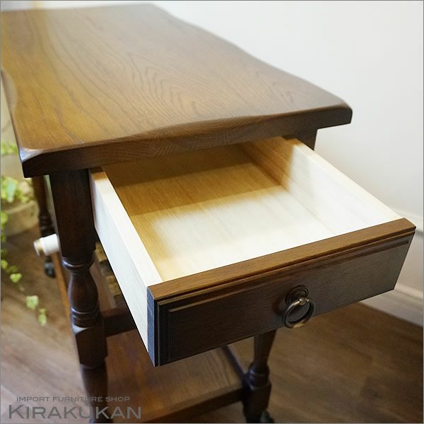 北海道は旭川の家具産地より、オーク材を使用した天板無垢のワゴンです。小引出しが前後に1個付いていますので、メモや印鑑・キーなど、すぐに取り出せて便利です。ワイン置きの棚も付いていますので、便利ですね。キャスターも付いています。ダイニングテーブルのサイドテーブルとして使いやすいワゴンです。