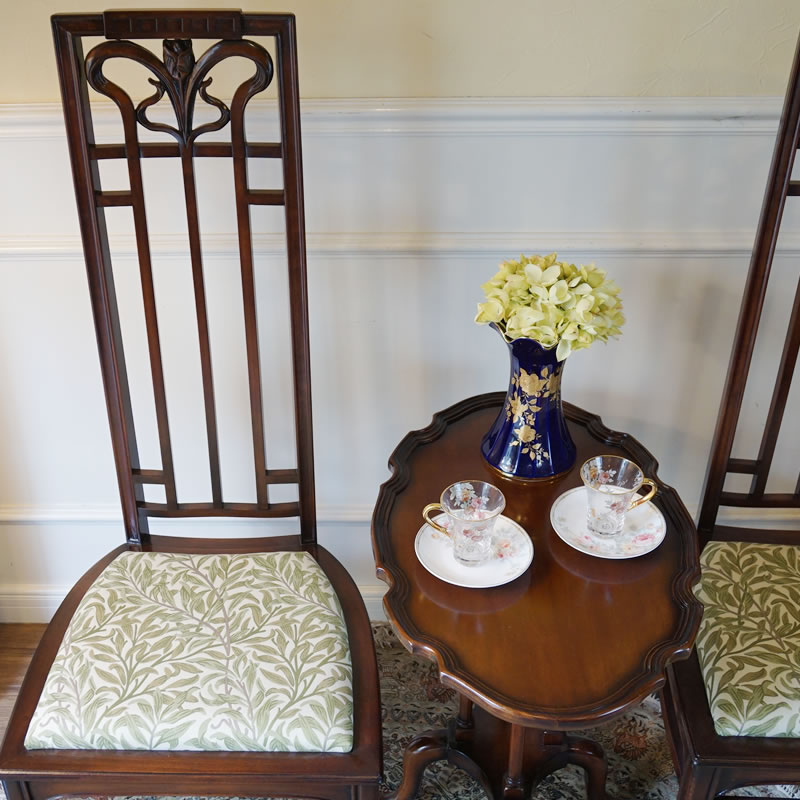 【コメント】ヴィンテージ・アールヌーボー様式の有名ブランドMedea・メデアのハイバックチェアです。張り地にはウィリアムモリス社の生地でフルーツを使い、よりヌーボー感を出しています。フレームは風合いをなくさないように再塗装しています。ヴィンテージ(USED)をご理解の上、ご購入ください。価値ある逸品です。