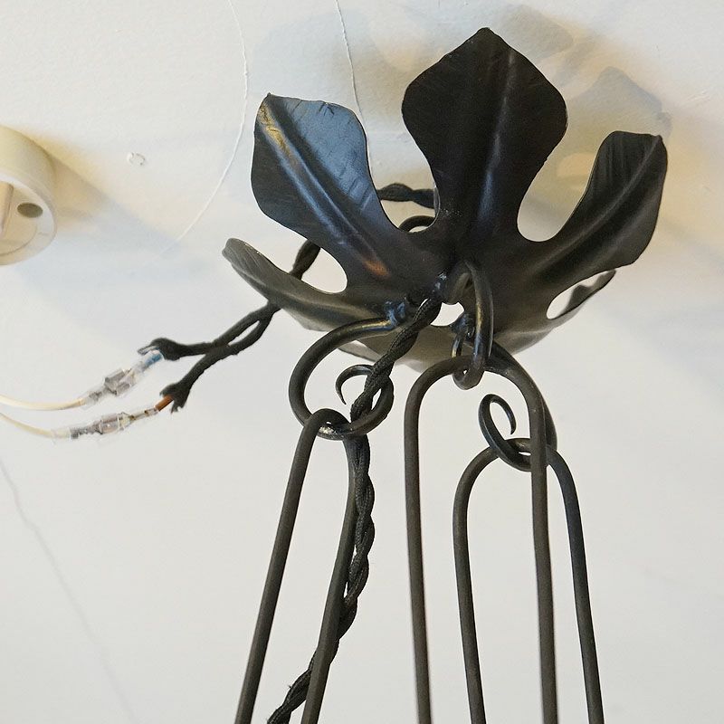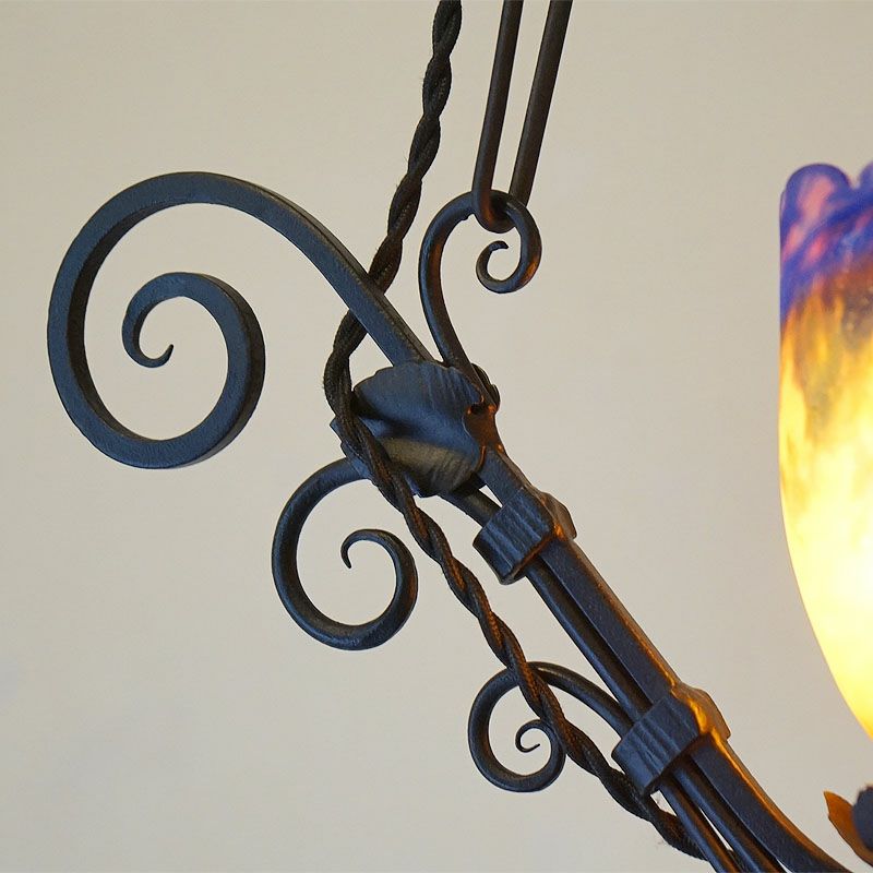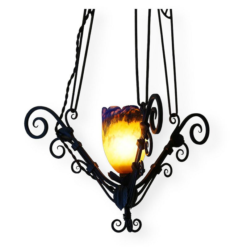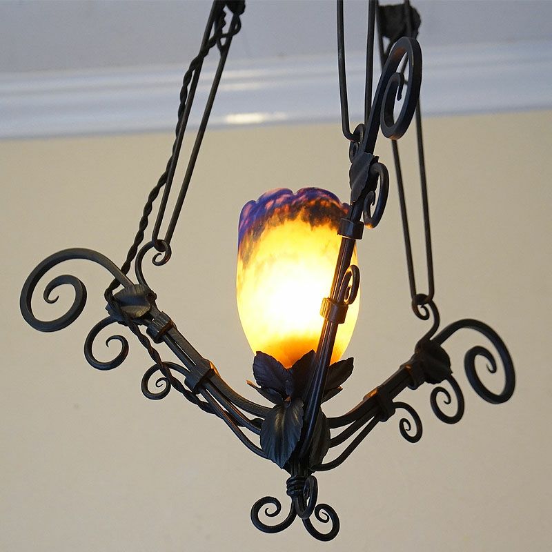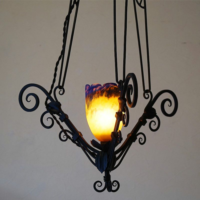 【コメント】アールヌーヴォー・アールデコ期の室内照明装飾作品の傑作として名高いミューラー兄弟の、優美な存在感を有す1灯式シャンデリアです。フランス・ドイツ国境地帯モーゼル出身で普仏戦争の折の疎開後、ガレの元でガラス製作技術を研鑽しアールーヌーヴォーガラスの大家として大成したミューラー兄弟による、彼らが1910年代から1920年代頃、注心し製作したヴィトリフィカシオン彩ガラスを用いた物です。又、この作品には製作当時からの貴重なアールデコ期の華麗かつ見事な植物造形装飾の錬鉄製吊り金具が付きます。このランプのシェードに用いられた装飾は、欧州などでヴィトリオフィカシオンと呼ばれるアールヌーヴォー・アールデコガラスの代表的技術を用いた物で製作中に色ガラスの粉をまぶし付け、様々な色合いの混ざり合いを演出します。造形は、一点一点型を粉砕して創り出される量産の出来ないパートドヴェールで、やわらかい曲線のフォルムに、落ち着いたヴィトリオフィカシオンの色合いと相まって、質実の中に優美さを備えます。ヴィンテージ(USED)をご理解の上、ご購入ください。価値ある逸品です。
