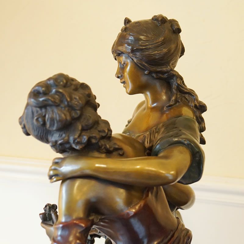 3. アンティーク ブロンズ像 置物 Auguste Moreau オーギュスト モロー作「ふたりの少女 花摘み」オブジェ 大理石
