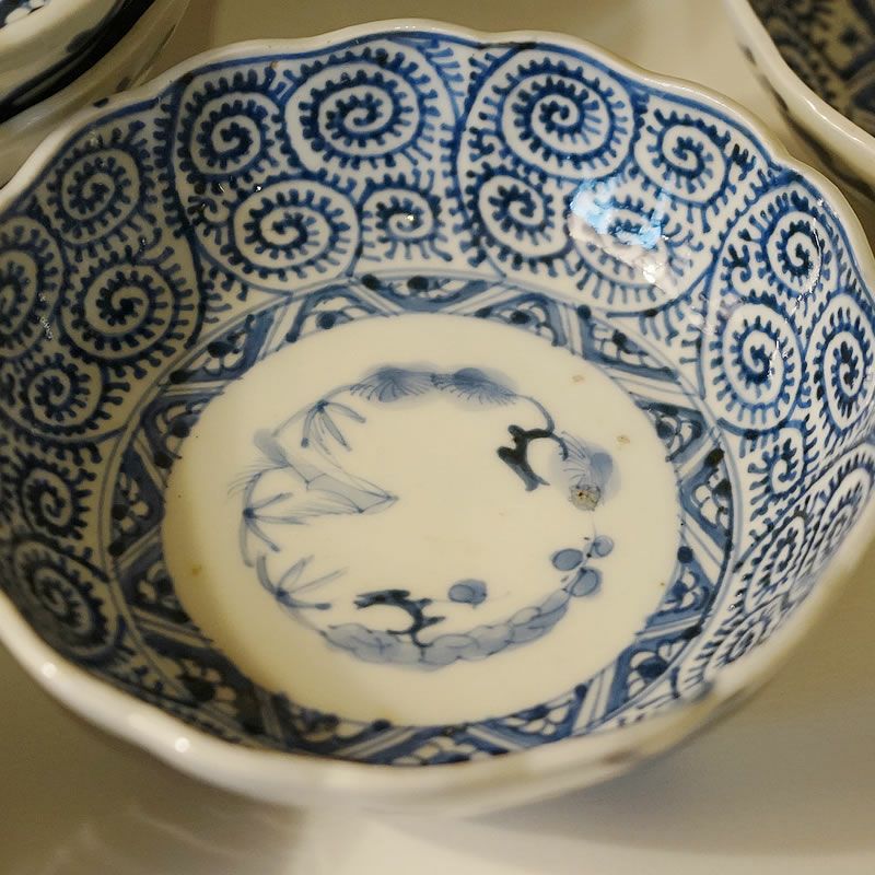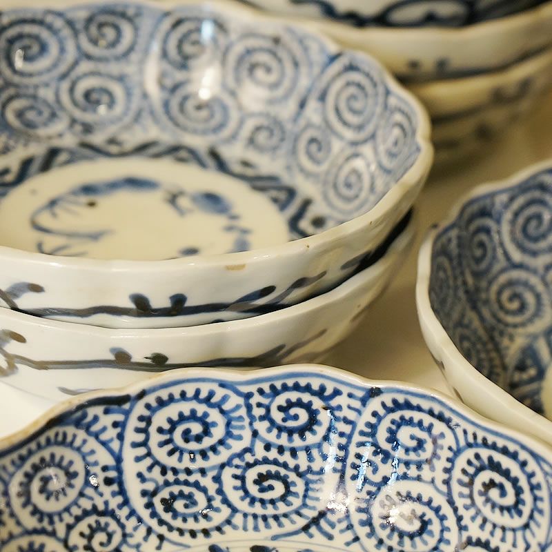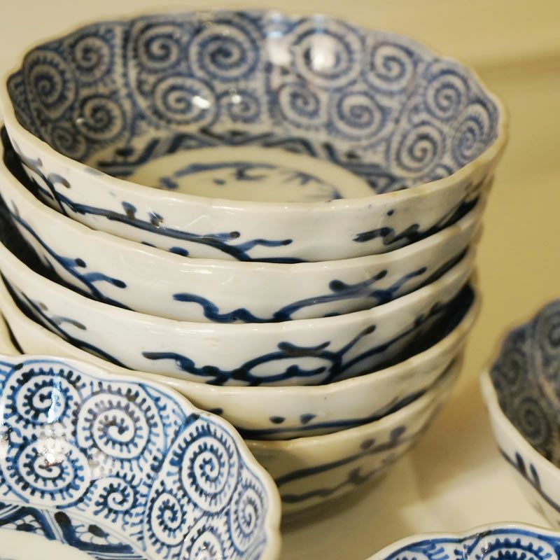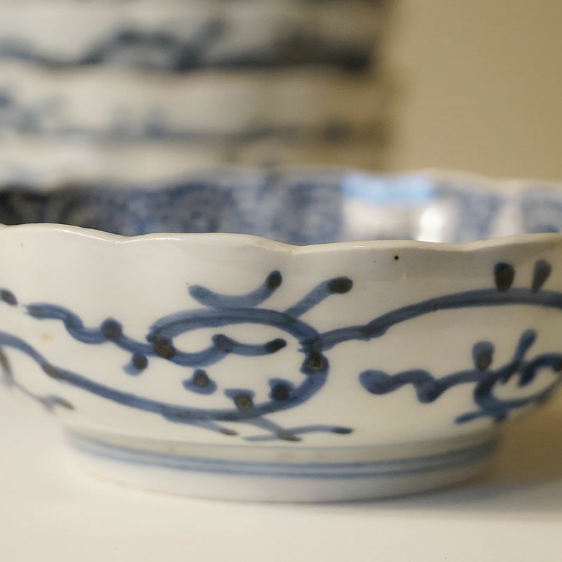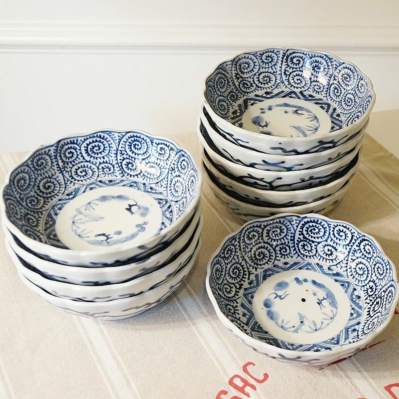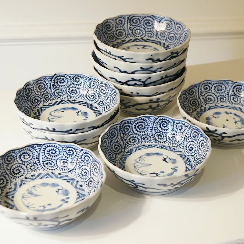 【コメント】日本アンティークの古伊万里の蛸唐草文の丸皿の10枚セットです。子もデザインのお皿で10枚揃いを探すのは難しいです。英国アンティークのテーブルにもよく似合う、人気の食器です。数ある文様の中でも人気のある蛸唐草の丸皿は、欲しくなります。食卓が華やかで楽しくなるアイテムです。