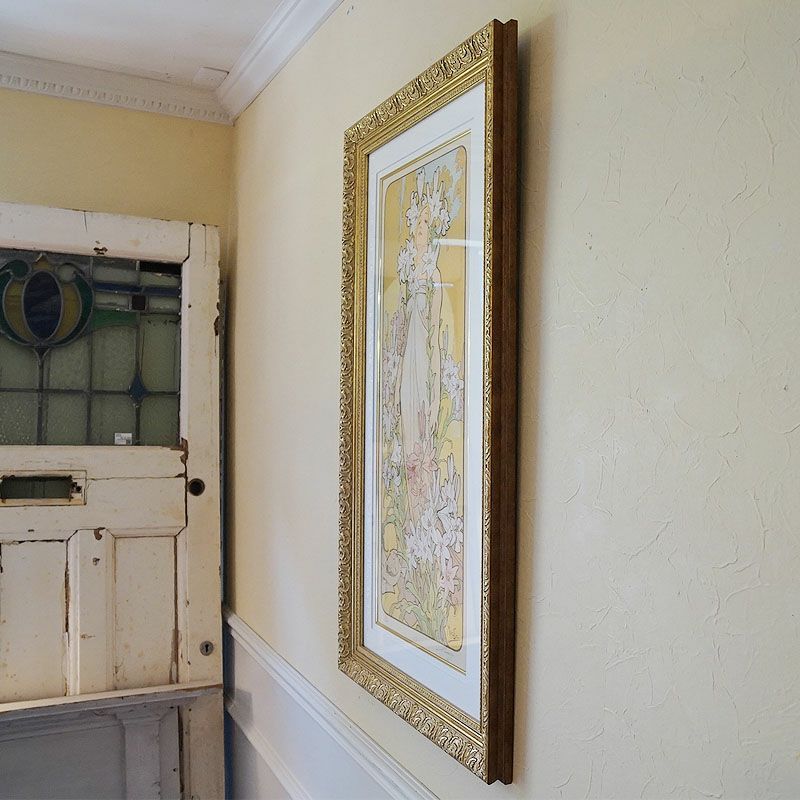 【コメント】ミュシャの代表作「四つの花」4枚セット のリトグラフです。摺師のサインが書かれています。世界で300枚刷られた希少品のリトグラフです。フランスの雰囲気あるインテリアに演出されます。