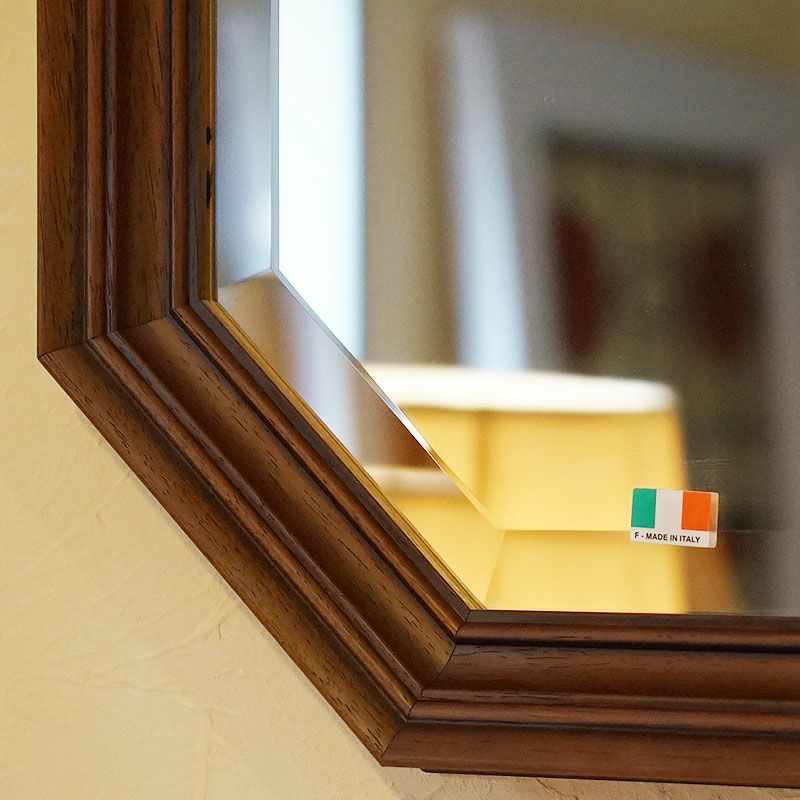 【コメント】・開運で話題の八角ミラー、数あるイタリア製のミラーから選びました。お手ごろ価格で、使いやすい大きさ・サイズ、シンプルなウオールナット仕上げで、一番スタンダードな枠のミラーです。インテリアの好きな方にとっては、手に入れておきたい一枚ですね? スタンダードは飽きませんし、飾る場所も選びません。塗り壁・クロス紙・土壁・等OKです。※こちらの商品はアンティーク仕上げのため、敢えて塗装剥げや汚しを出しております。不良品ではございませんので何卒ご理解の上お買い求めください。