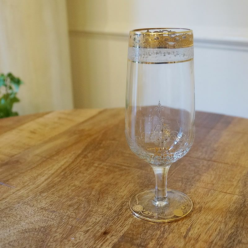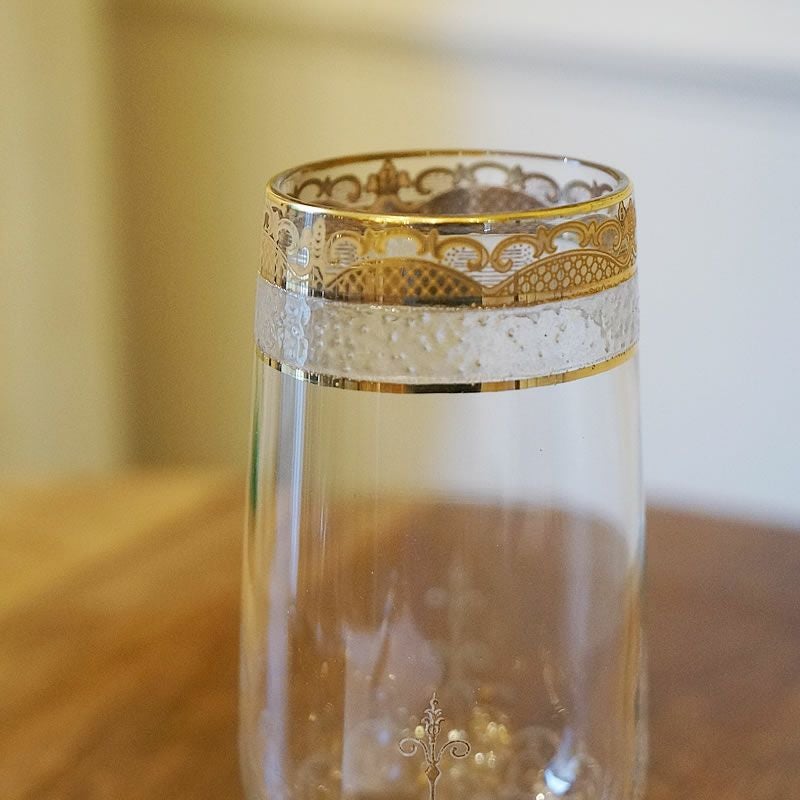 【コメント】クラシック柄が綺麗なグラスで、渋めの茶色にゴールドがいいですね。この価格とは思えない飾りグラスです。