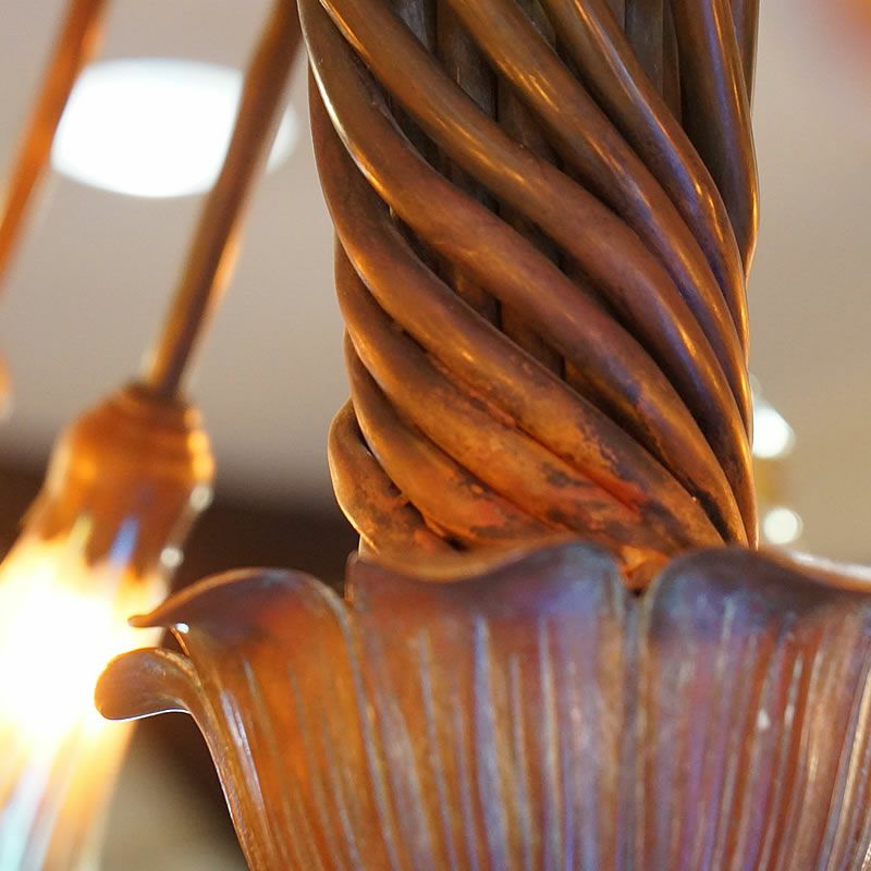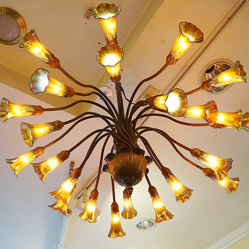 【コメント】イタリア製 ティファニースタイル ペンダントライト 24灯 リリィランプです。天井照明のリリィランプは珍しく、ここ数十年見たことはありません。国内に何点存在するか?わかりません。配線は国内で行っております。残念ながら、地震の際にシェードが2個落下し、破損いたしました。ボンドで厳重に補修はいたしましたが、気になられる方はご遠慮ください。本体に取り付けていると、あまり気になりません。本当にきれいなシェードで、点灯すると更に美しいランプです。取り付けには電気工事が必要です。