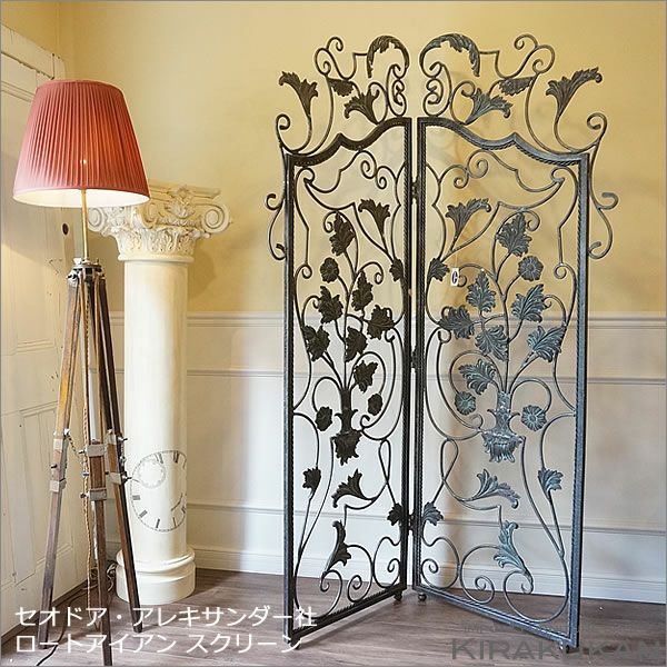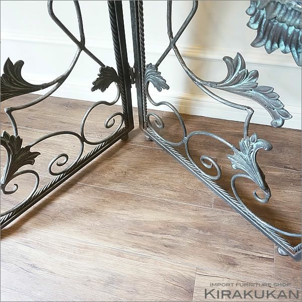 【コメント】手作りのロートアイアン製のクラシックデザインの2枚スクリーンです。中心から折れますので、収納もたためますので企画的場所を取りません。このスクリーンをコーナーに設置するだけで、クラシックのインテリアが広がります。本物のロートアイアンの質感とクラシック仕上げは重厚でゴージャスです。お部屋のアクセントにピッタリです。発送までお時間がかかる場合がございますので納期をご確認ください。