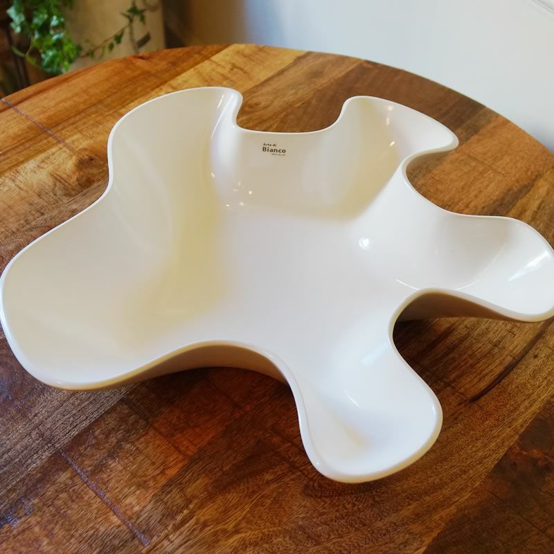 【コメント】流線型の真っ白な花器です。お花が映えること間違いなし。そのほかプレートとして、オブジェとしていろいろ使えそうです。今回は長期展示しておりましたので、訳ありセールにさせていただきました。