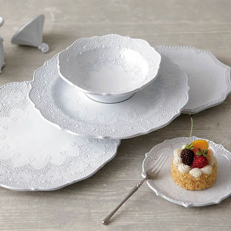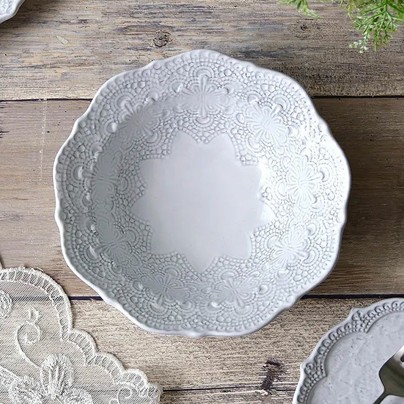 【コメント】上品なレースをモチーフとしたテーブルウェアは、特別なおもてなしやギフトに最適です。電子レンジ・食洗機・オーブンがご利用いただけます。すべてハンドメイドの為、色ムラ、黒点、気泡など、商品に個体差が生じる場合がございます。