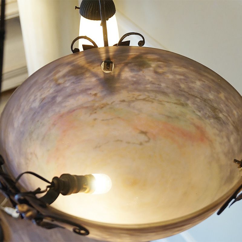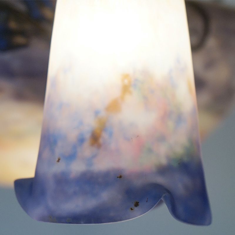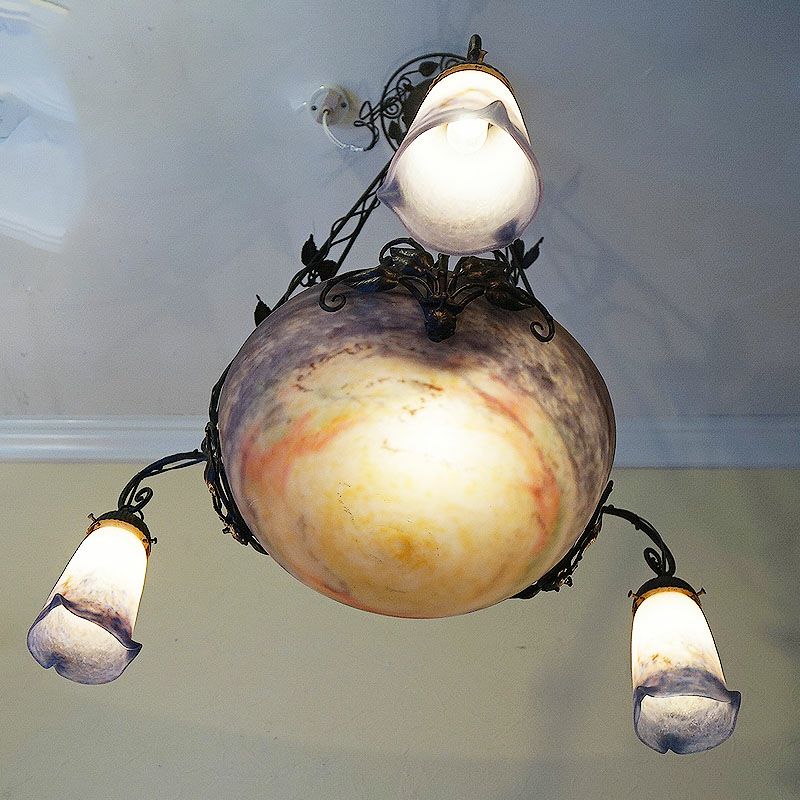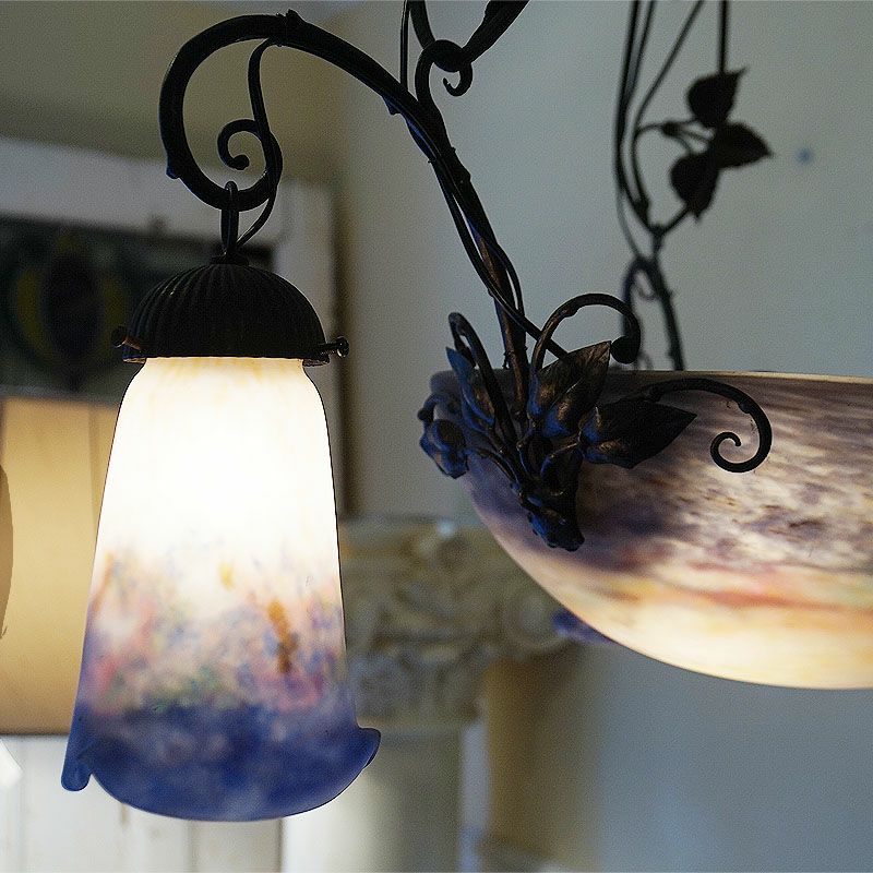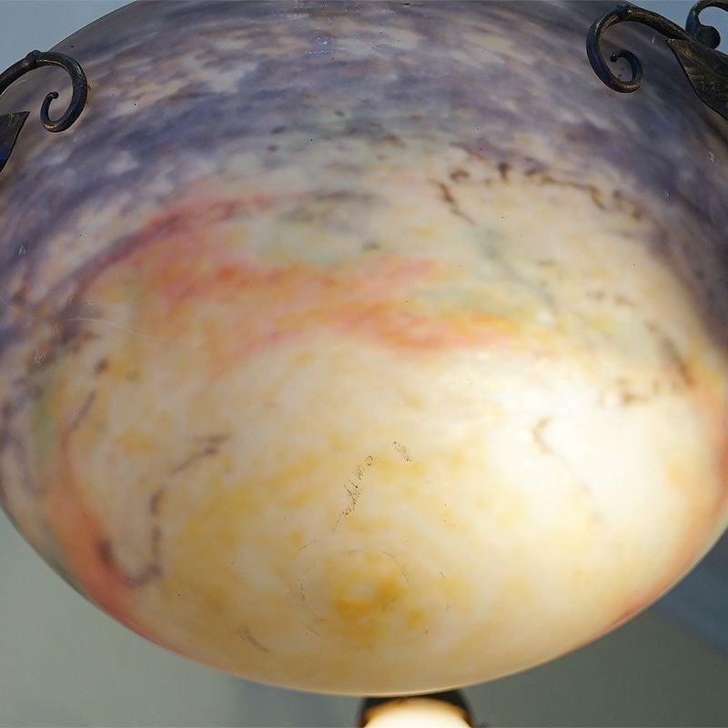 【コメント】アールヌーヴォー・アールデコ期の室内照明装飾作品の傑作として名高いミューラー兄弟の、優美な存在感を有す4灯式シャンデリアです。フランス・ドイツ国境地帯モーゼル出身で普仏戦争の折の疎開後、ガレの元でガラス製作技術を研鑽しアールーヌーヴォーガラスの大家として大成したミューラー兄弟による、彼らが1910年代から1920年代頃、注心し製作したヴィトリフィカシオン彩ガラスを用いた物です。又、この作品には製作当時からの貴重なアールデコ期の華麗かつ見事な植物造形装飾の錬鉄製吊り金具が付きます。このランプのシェードに用いられた装飾は、欧州などでヴィトリオフィカシオンと呼ばれるアールヌーヴォー・アールデコガラスの代表的技術を用いた物で製作中に色ガラスの粉をまぶし付け、様々な色合いの混ざり合いを演出します。造形は、一点一点型を粉砕して創り出される量産の出来ないパートドヴェールで、やわらかい曲線のフォルムに、落ち着いたヴィトリオフィカシオンの色合いと相まって、質実の中に優美さを備えます。ヴィンテージ(USED)をご理解の上、ご購入ください。価値ある逸品です。
