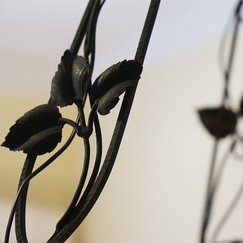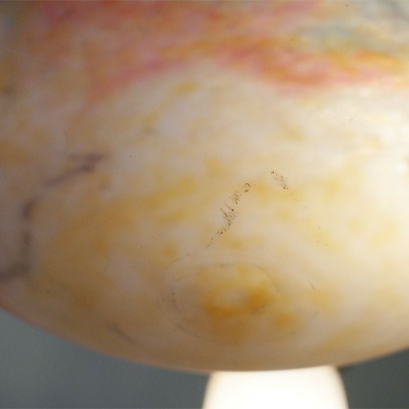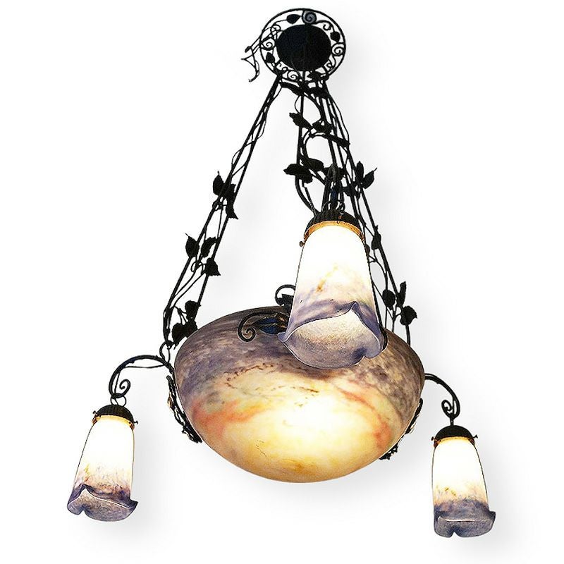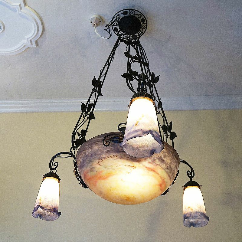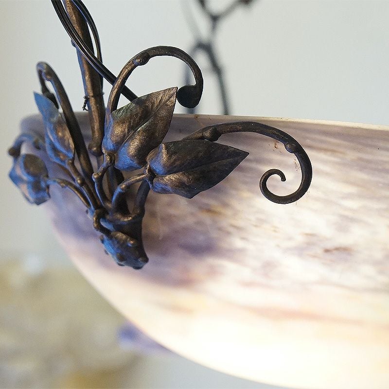 【コメント】アールヌーヴォー・アールデコ期の室内照明装飾作品の傑作として名高いミューラー兄弟の、優美な存在感を有す4灯式シャンデリアです。フランス・ドイツ国境地帯モーゼル出身で普仏戦争の折の疎開後、ガレの元でガラス製作技術を研鑽しアールーヌーヴォーガラスの大家として大成したミューラー兄弟による、彼らが1910年代から1920年代頃、注心し製作したヴィトリフィカシオン彩ガラスを用いた物です。又、この作品には製作当時からの貴重なアールデコ期の華麗かつ見事な植物造形装飾の錬鉄製吊り金具が付きます。このランプのシェードに用いられた装飾は、欧州などでヴィトリオフィカシオンと呼ばれるアールヌーヴォー・アールデコガラスの代表的技術を用いた物で製作中に色ガラスの粉をまぶし付け、様々な色合いの混ざり合いを演出します。造形は、一点一点型を粉砕して創り出される量産の出来ないパートドヴェールで、やわらかい曲線のフォルムに、落ち着いたヴィトリオフィカシオンの色合いと相まって、質実の中に優美さを備えます。ヴィンテージ(USED)をご理解の上、ご購入ください。価値ある逸品です。