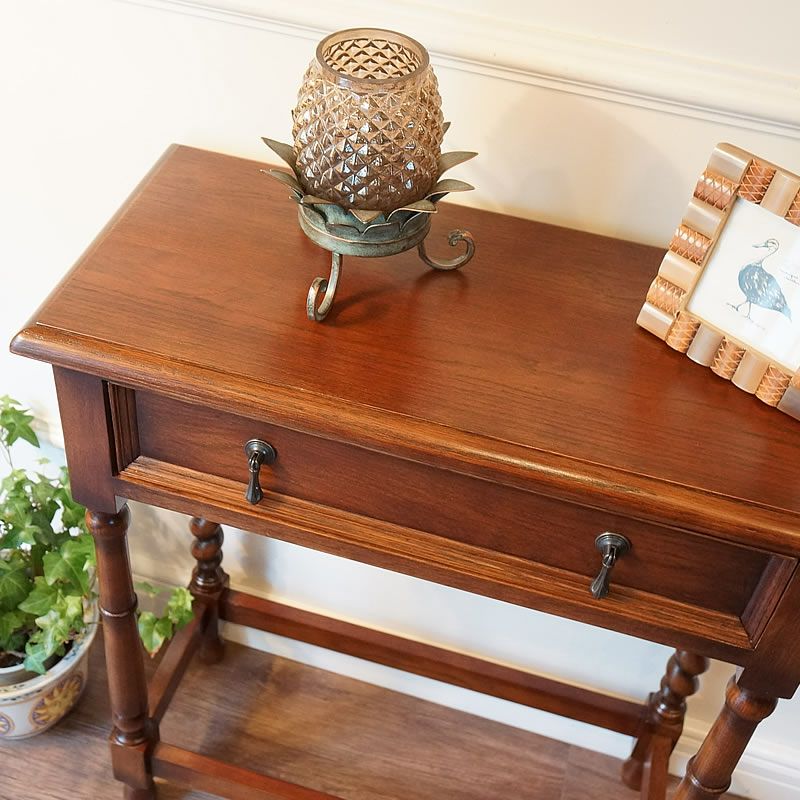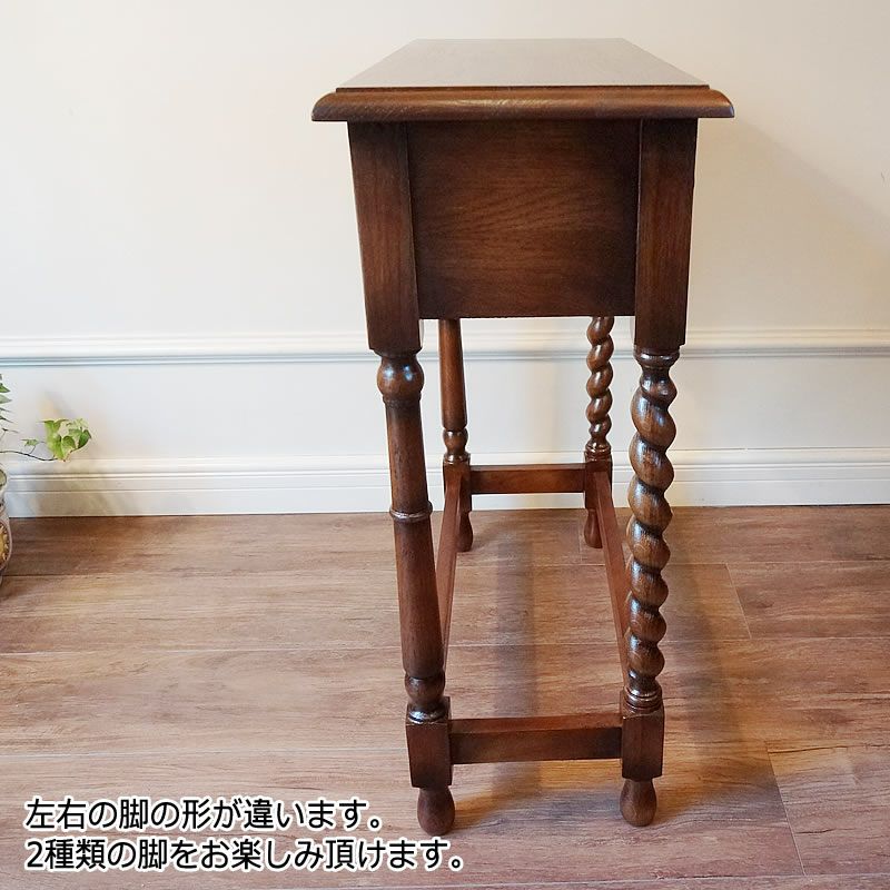 【コメント】イギリスアンティークを本物そっくりに再現したリプロダクト家具で、落ち着きのある空間を演出します。オーク材の無垢をふんだんに使用したコンソールテーブルです。脚は人気のツイストレッグを使用しています。前面・後面がなく、どちらも違うデザインされており、お楽しみいただける珍しいコンソールテーブルです。他にも花台やランプテーブルとしても使いやすいテーブルです。英国アンティークの雰囲気を演出してくれる家具です。