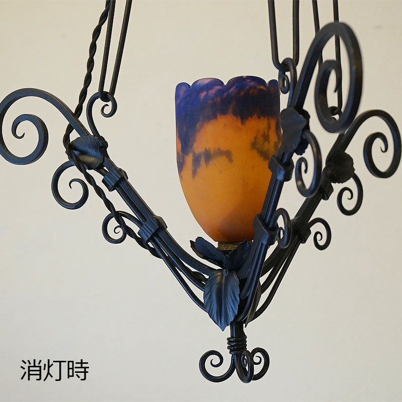 【コメント】アールヌーヴォー・アールデコ期の室内照明装飾作品の傑作として名高いミューラー兄弟の、優美な存在感を有す1灯式シャンデリアです。フランス・ドイツ国境地帯モーゼル出身で普仏戦争の折の疎開後、ガレの元でガラス製作技術を研鑽しアールーヌーヴォーガラスの大家として大成したミューラー兄弟による、彼らが1910年代から1920年代頃、注心し製作したヴィトリフィカシオン彩ガラスを用いた物です。又、この作品には製作当時からの貴重なアールデコ期の華麗かつ見事な植物造形装飾の錬鉄製吊り金具が付きます。このランプのシェードに用いられた装飾は、欧州などでヴィトリオフィカシオンと呼ばれるアールヌーヴォー・アールデコガラスの代表的技術を用いた物で製作中に色ガラスの粉をまぶし付け、様々な色合いの混ざり合いを演出します。造形は、一点一点型を粉砕して創り出される量産の出来ないパートドヴェールで、やわらかい曲線のフォルムに、落ち着いたヴィトリオフィカシオンの色合いと相まって、質実の中に優美さを備えます。ヴィンテージ(USED)をご理解の上、ご購入ください。価値ある逸品です。