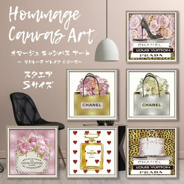 【商品名】ブランド キャンバスアート「ゴールドバッグ ピンク ブーケ(スクエアS)」シャネル 絵画 インテリア 額入り