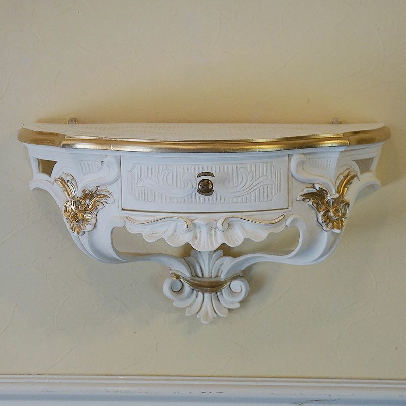 【コメント】イタリア製のホワイトをベースにロマンチックスタイルの壁掛けコンソールです。ポイントは、中央に施された引出しが便利、ゴールドがおしゃれのアクセントになっています。左右2ヶ所の掛け金具によりお好きな壁面に飾ることができます。可愛いプランターを置いたり、小物を飾ったり、使いからはアイデア次第ですね。