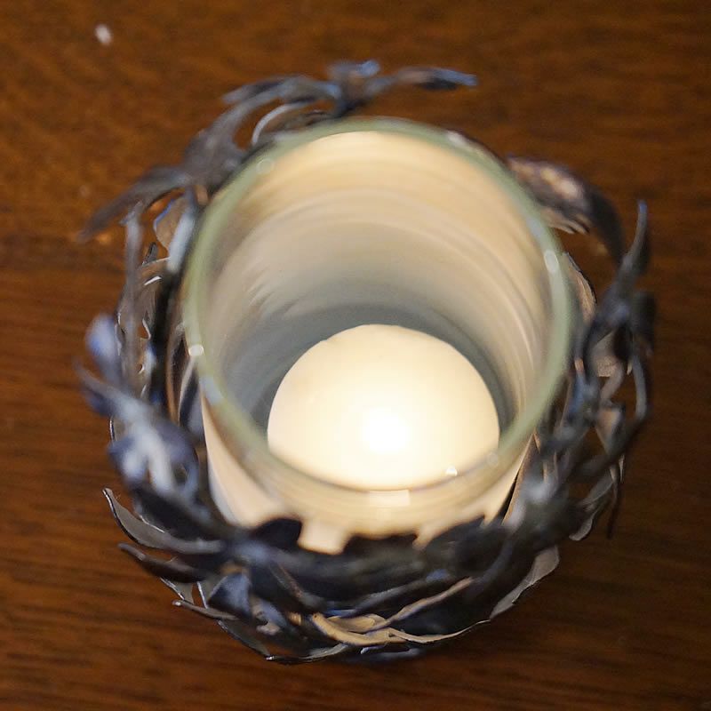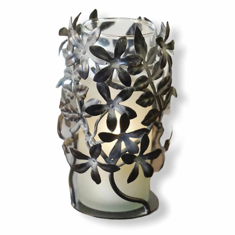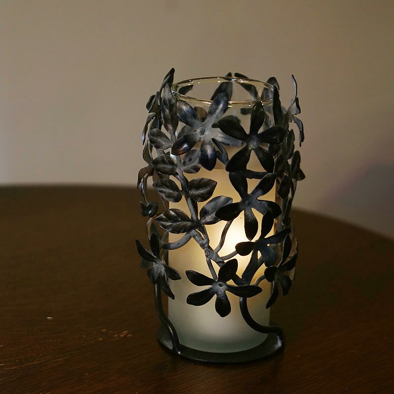 【コメント】ジャスミンの花をモチーフにしたアイアンの花瓶です。フレームはアイアンで花瓶はスモーク仕上げのガラスになります。スモークなので、キャンドルホルダーとしてもご利用いただけます。プレゼントにもおしゃれなアイテムです。