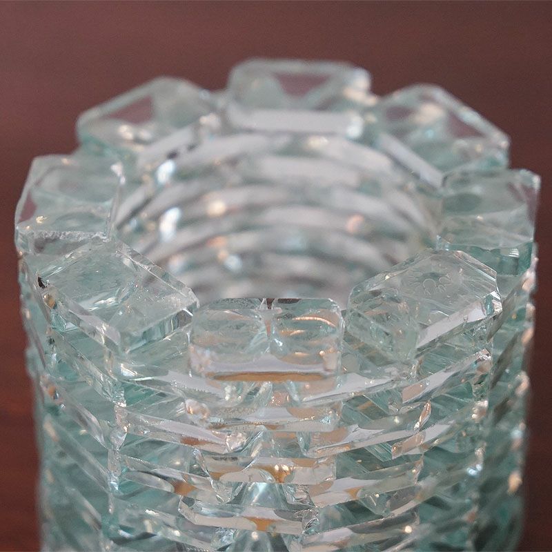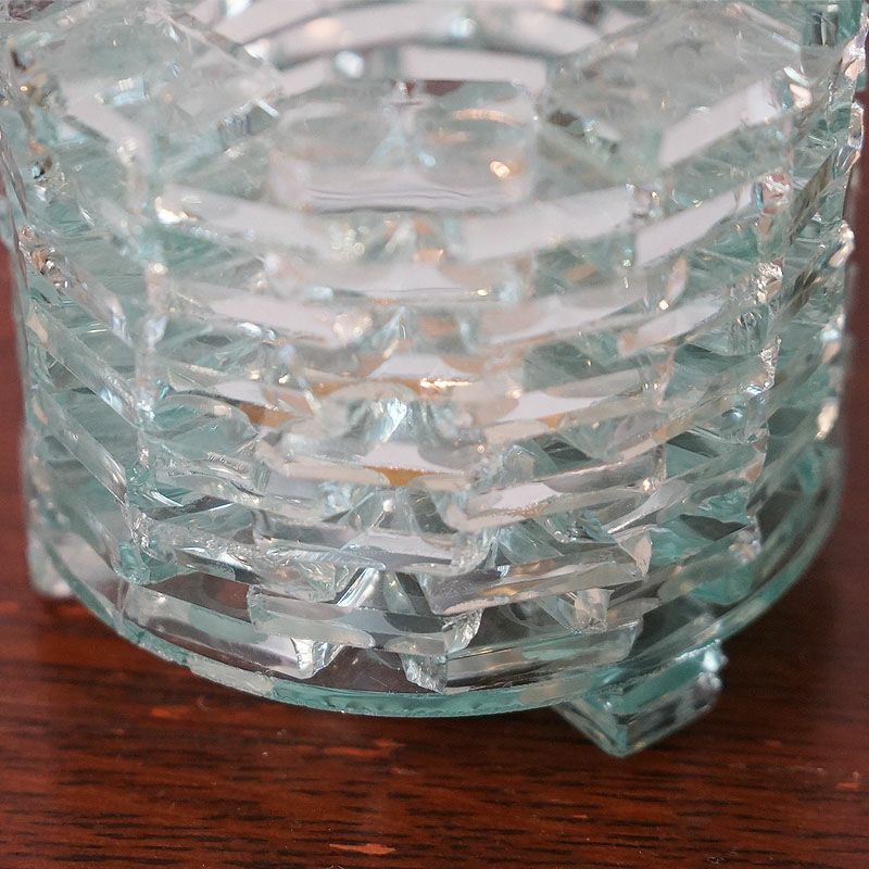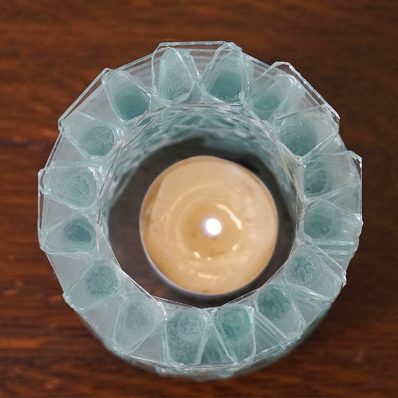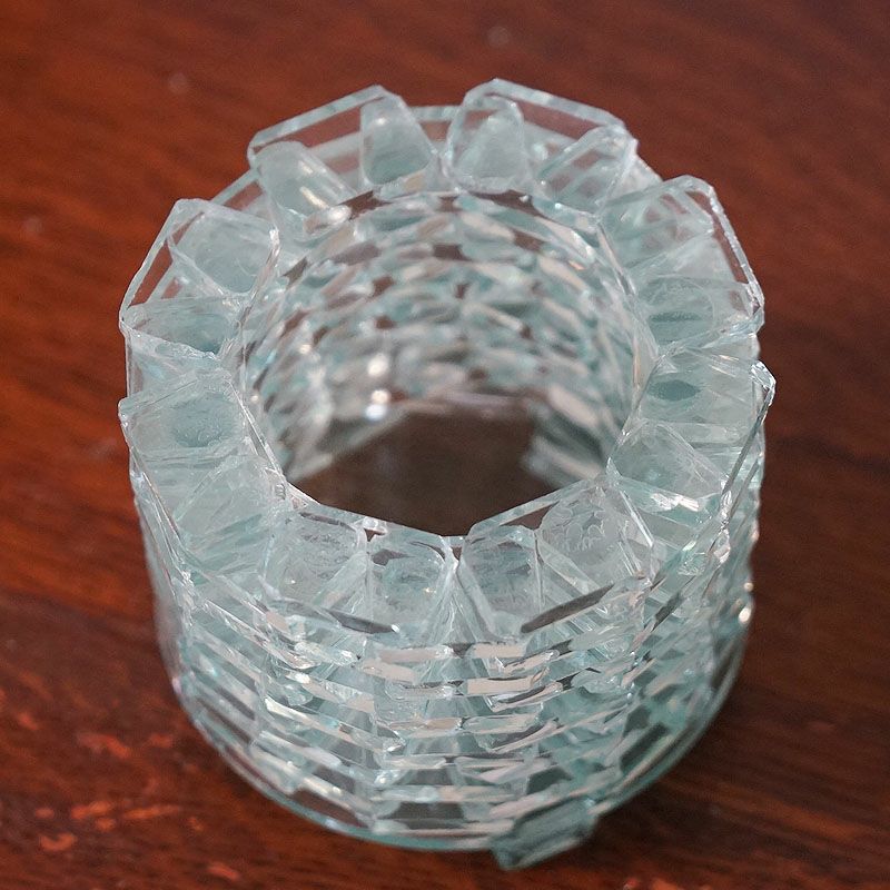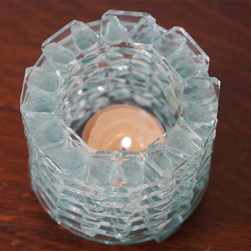 【キャンドル】細かいガラスを積み上げて作ったキャンドルホルダーです。ガラスの隙間から漏れてくる光はおしゃれで癒やされます。テーブルの上が華やかで楽しくなるアイテムです。飾っておくだけでもお洒落です。