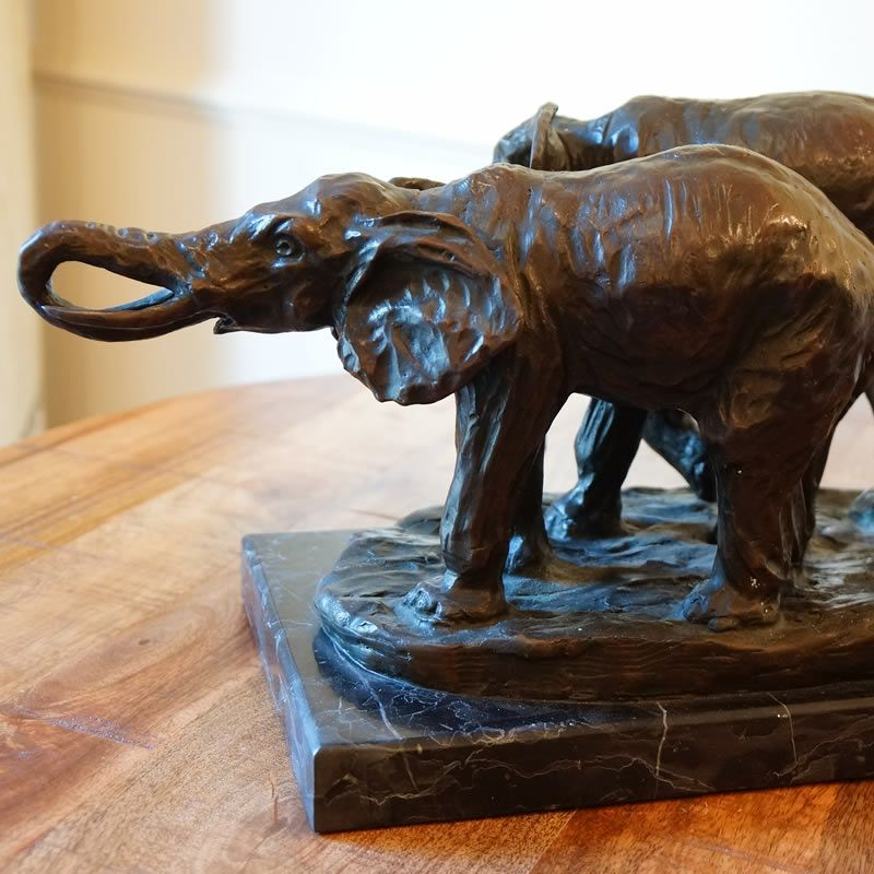 【コメント】セオドア・アレキサンダー社の重厚感たっぷりのブロンズ製の2頭の象で、台座には大理石を使用しています。リビングのサイドボードやサイドテーブル・花台の上に飾って、インテリアのアイポイントに、ゴージャスな置物です。アンティークの空間はもとより、モダンな空間にもお似合いです。