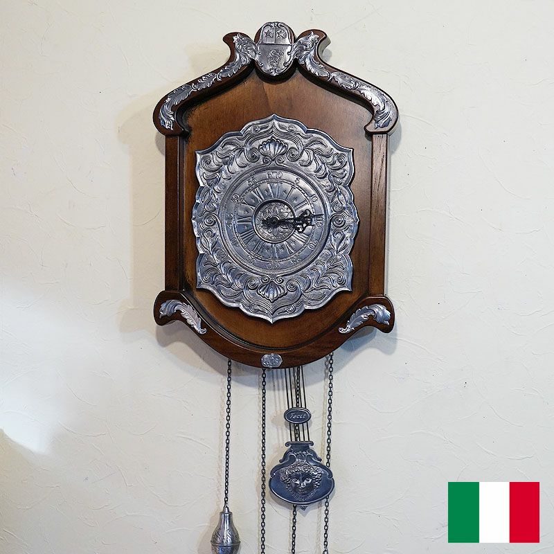 輸入雑貨で暮らしを豊かに楽しく!| イタリア製 アンティーク 掛け時計 木製 振り子付 クオーツ すず製 ピューター製