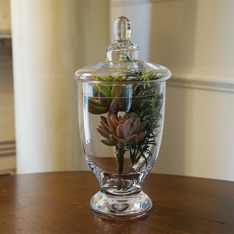 【コメント】フランスデザインのガラスポットです。小物やお菓子などを入れてテーブルの上を楽しく演出するガラスポットです。観葉植物を入れてプランターカバーとしても、蓋を外して花瓶としても使用できますね。使い方はアイデア次第ですね。プレゼント・ギフトにもいかがですか?