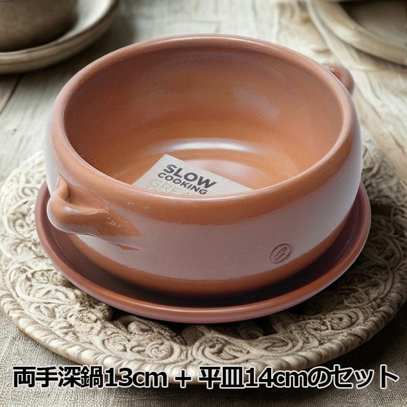【商品名】スペイン グラウペラ社製 両手深鍋 アヒージョ鍋 13cm + 平皿 14cm セット テラコッタ陶器 カスエラ 生活雑貨 プロ 食器 レストラン使用