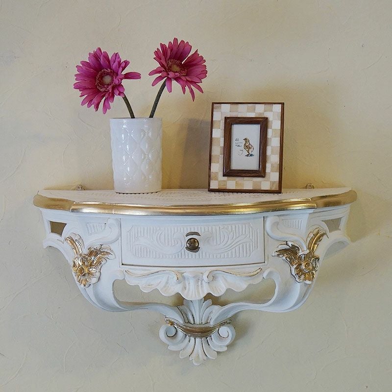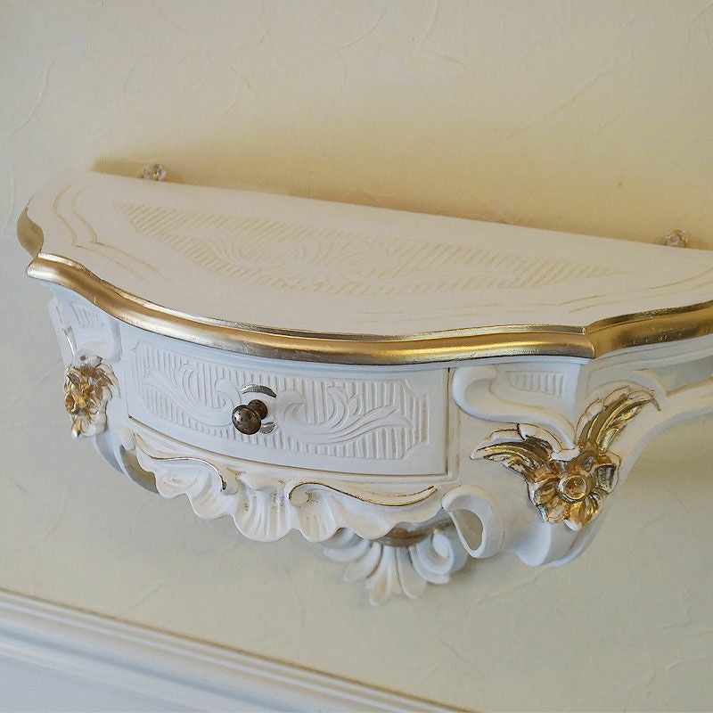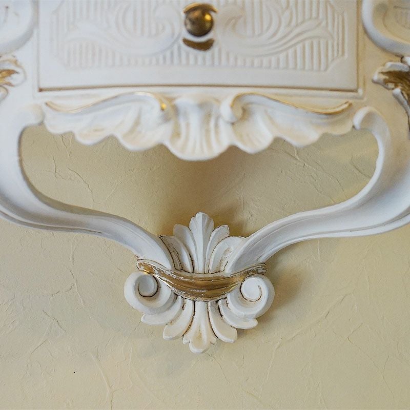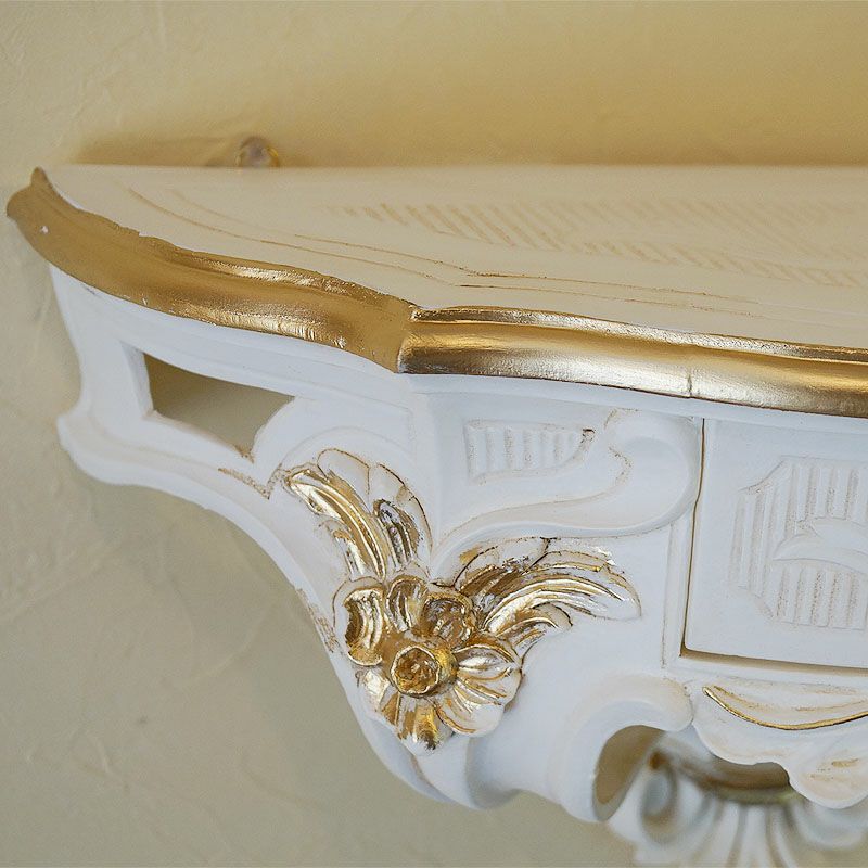 【コメント】イタリア製のホワイトをベースにロマンチックスタイルの壁掛けコンソールです。ポイントは、中央に施された引出しが便利、ゴールドがおしゃれのアクセントになっています。左右2ヶ所の掛け金具によりお好きな壁面に飾ることができます。可愛いプランターを置いたり、小物を飾ったり、使いからはアイデア次第ですね。