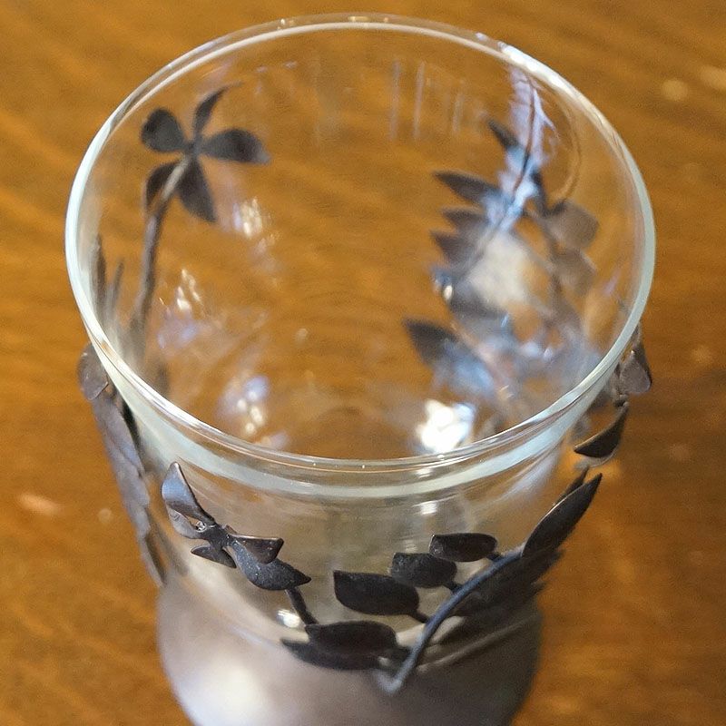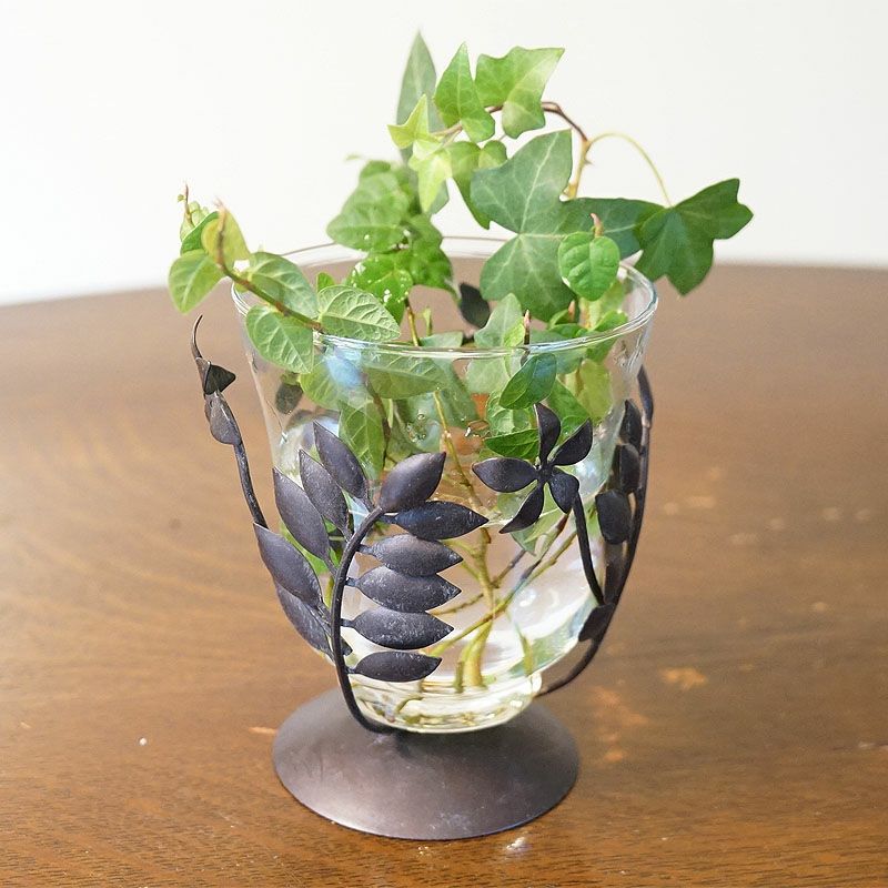【コメント】花瓶というよりはオブジェ感覚。アイアンでできた植物のデザインがフレームになっていて、ガラスの花瓶を取り囲むように設置されている花瓶です。キャンドルホルダーとしてもおしゃれに使用できます。テーブルの上が華やかに演出されますね。プレゼントにも大変喜ばれています。ガラスは取り外せるのでお水を交換するのにも便利です。