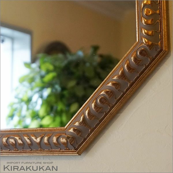 輸入雑貨|ミラー・鏡 シリーズ アンティーク 八角ミラー ゴールド LLサイズ Mirror(壁掛け鏡)八角形 鏡