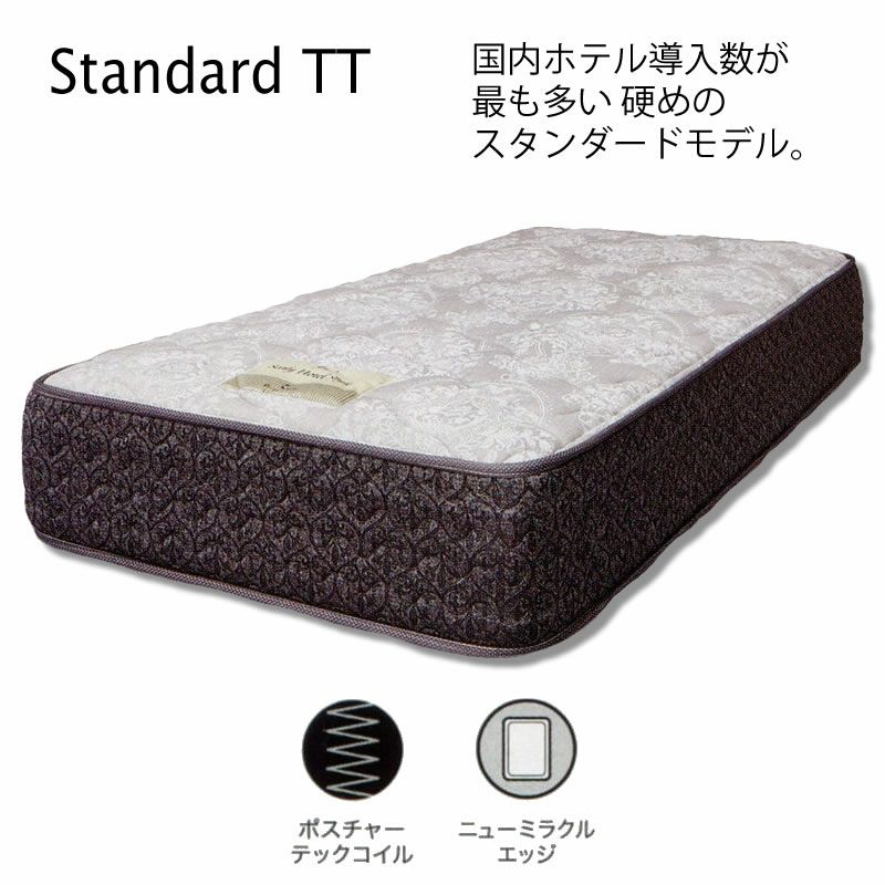 【コメント】「Standard TT スタンダードTTについて」国内ホテル導入数が最も多い、硬めのスタンダードモデル。外資系ホテルを中心に数多く採用されているシーリーの米国特許のポスチャーテックコイルを使用し、荷重に応じて反発力を調整することで体型、体重を問わず最適な寝心地を演出するリバーシブルタイプ。