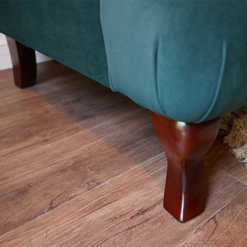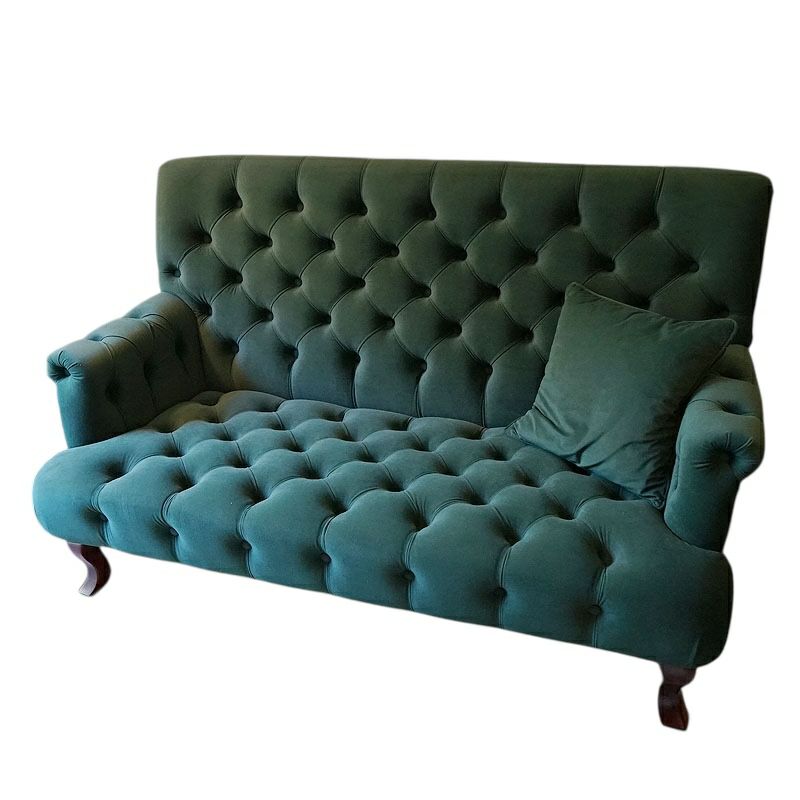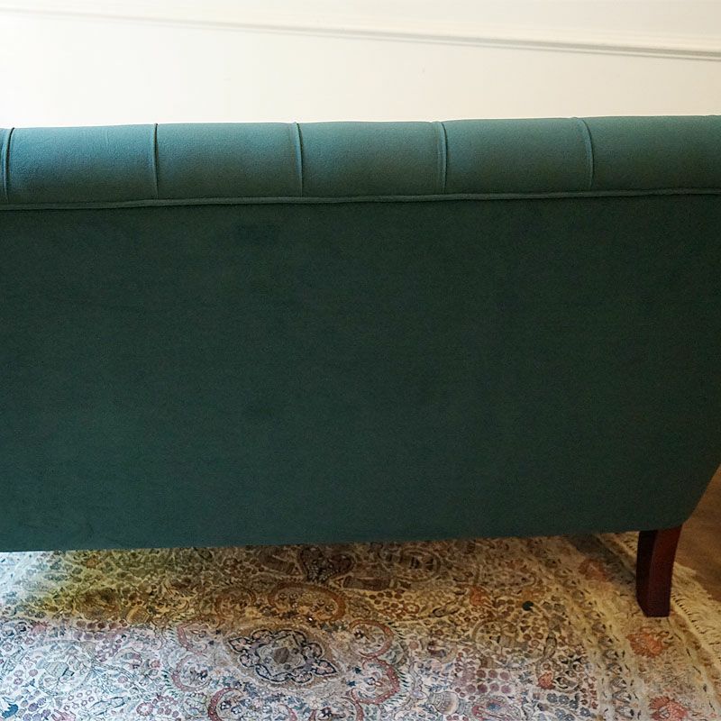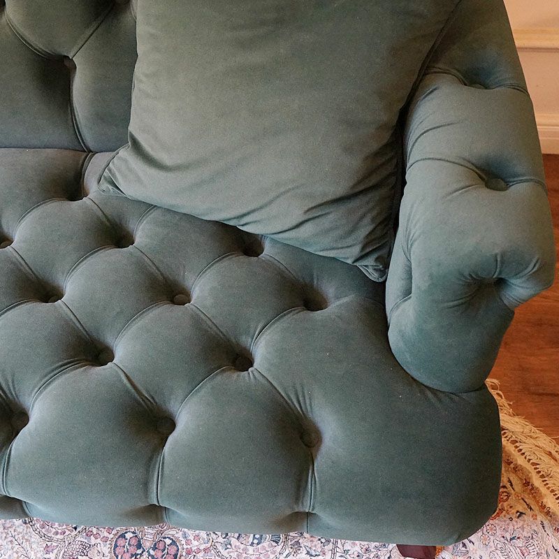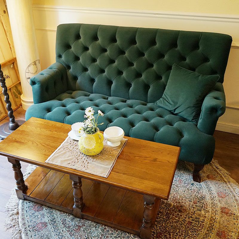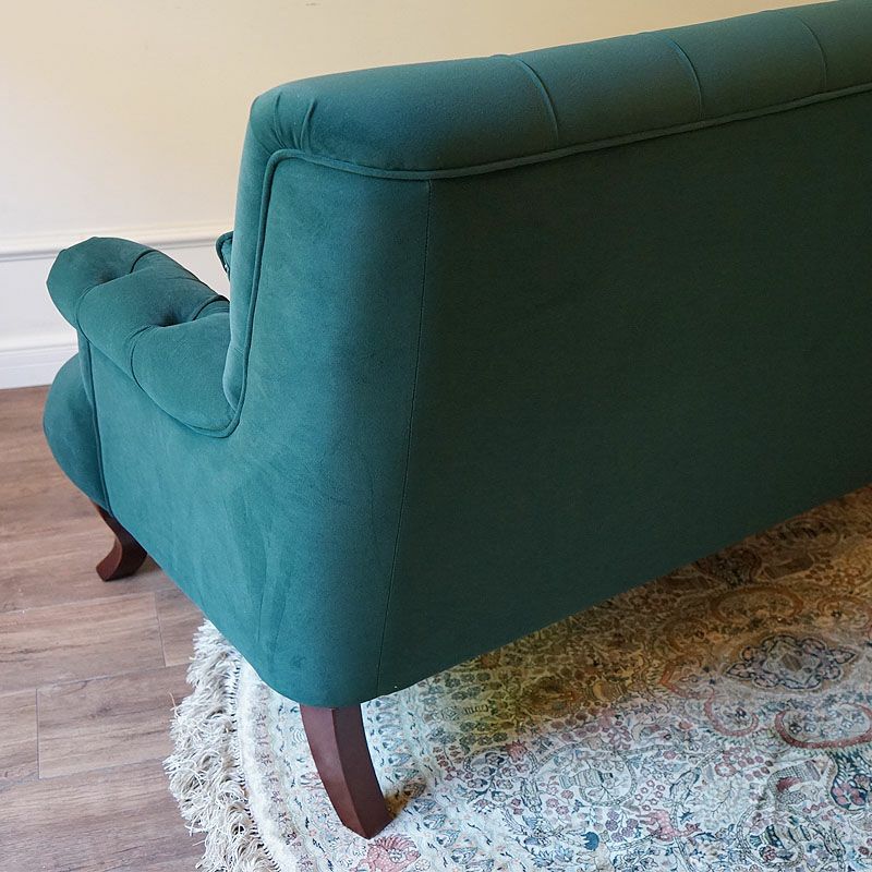 グリーンのモケットのファブリックにボタン留めのデザインがお洒落な二人掛けソファです。素敵なヨーロピアンインテリアをお楽しみください。