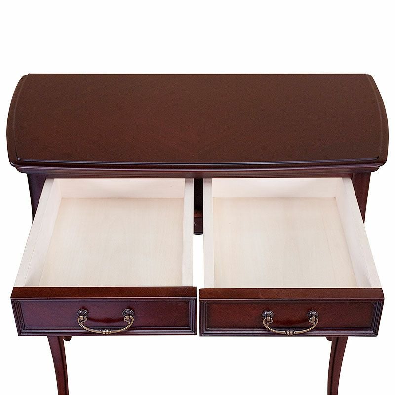 マホガニー材を贅沢に使い、表面は厳選された木目を使った化粧張りを施し、フレンチエレガンスの代名詞といえる「カブリオールレッグ」(猫脚)と、なめらかな女性的な美しいラインとマホガニー無垢材を削り出した彫刻が特徴です。