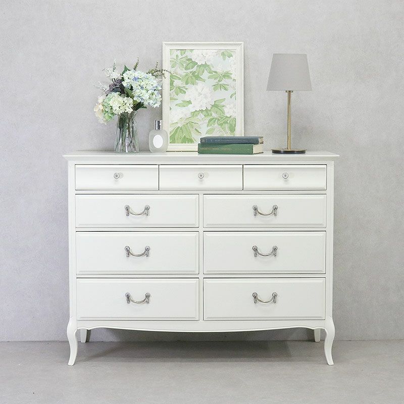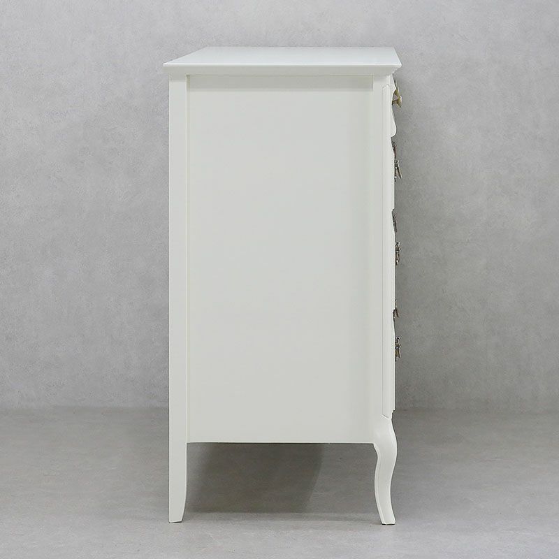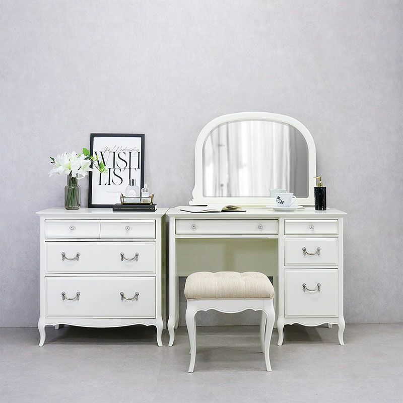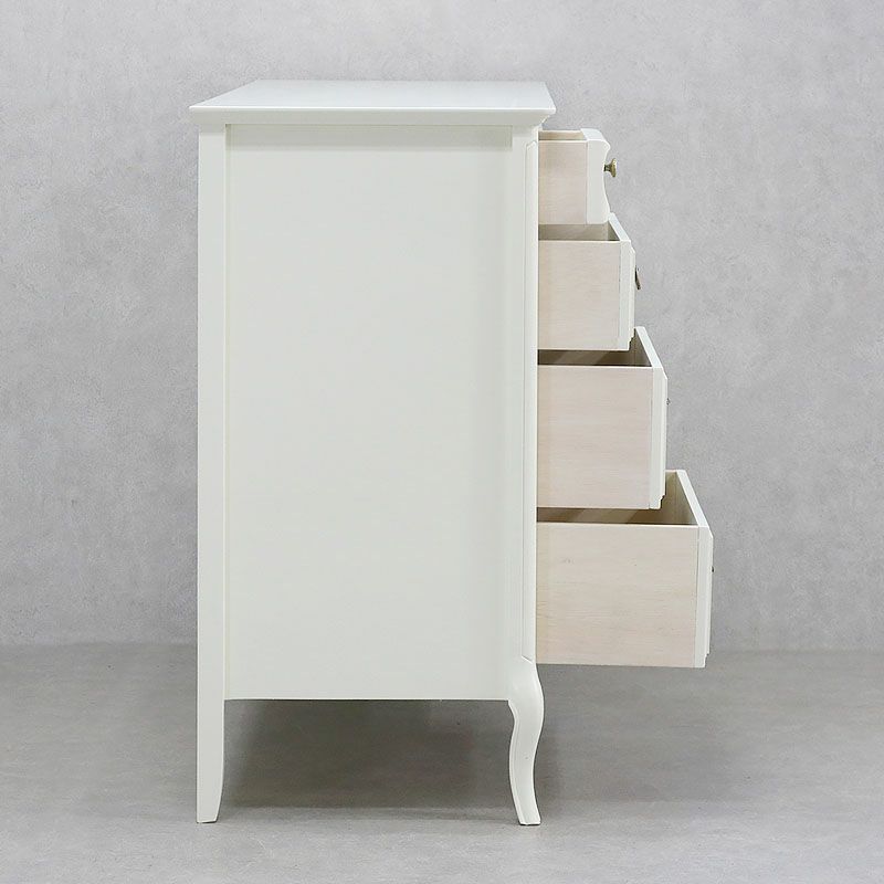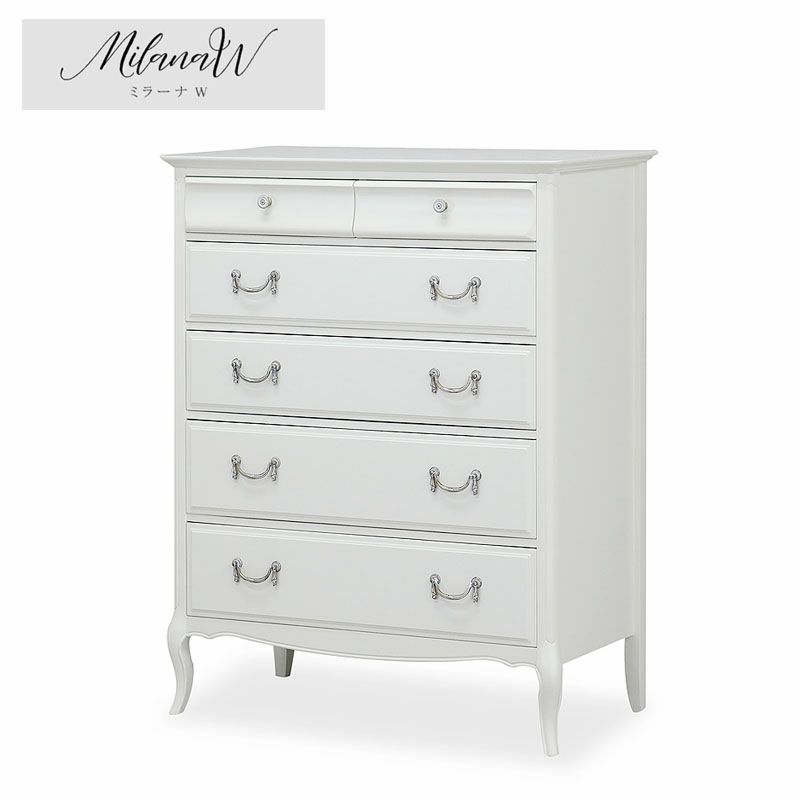 ミラーナWは、柔らかなアイボリーカラーは上品さとナチュラル感覚を併せ持ち、曲面を巧みに活かした丁寧な造りの引出し前板と、宮廷装飾を思わせるシャビー塗装した大きめの把手が印象的なエレガントで高級感漂うシリーズです。