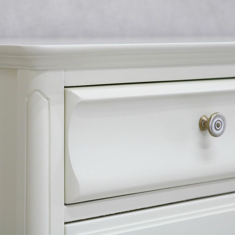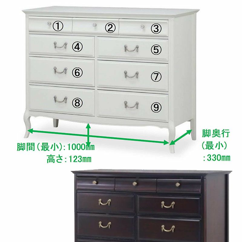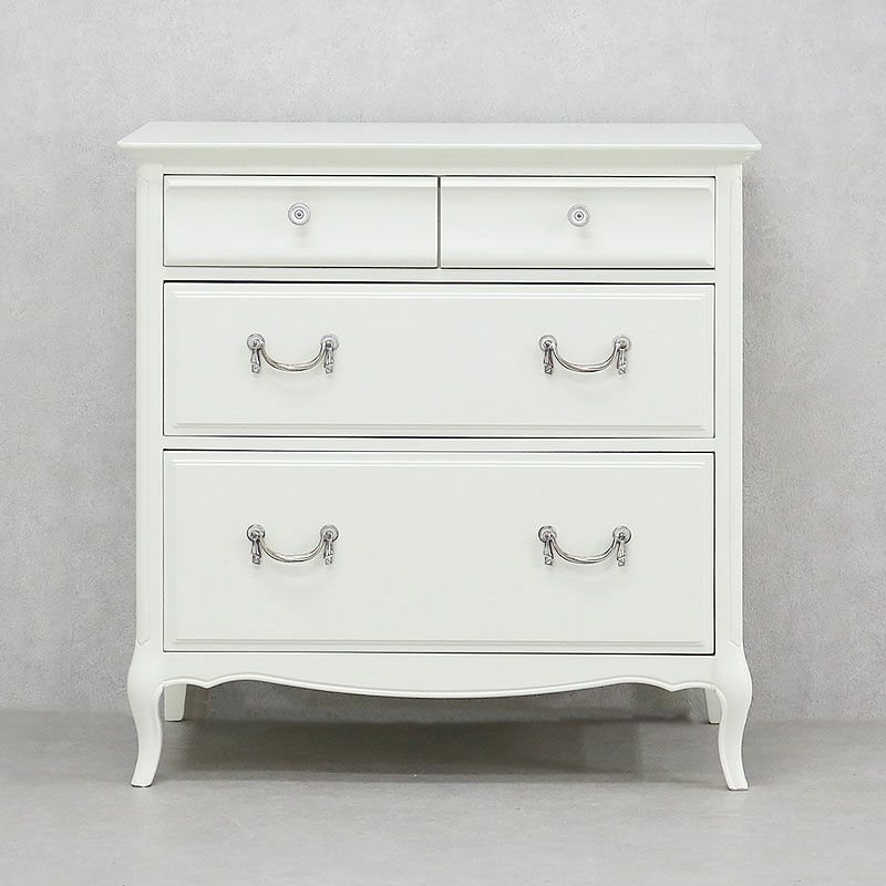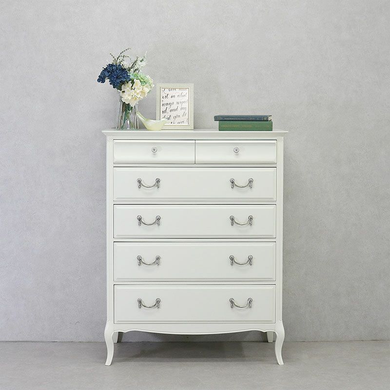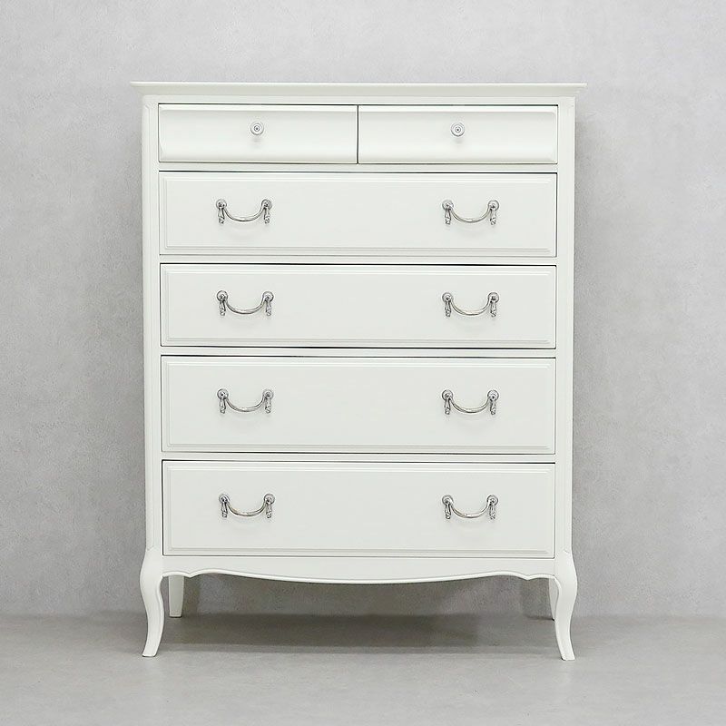 ミラーナWは、柔らかなアイボリーカラーは上品さとナチュラル感覚を併せ持ち、曲面を巧みに活かした丁寧な造りの引出し前板と、宮廷装飾を思わせるシャビー塗装した大きめの把手が印象的なエレガントで高級感漂うシリーズです。