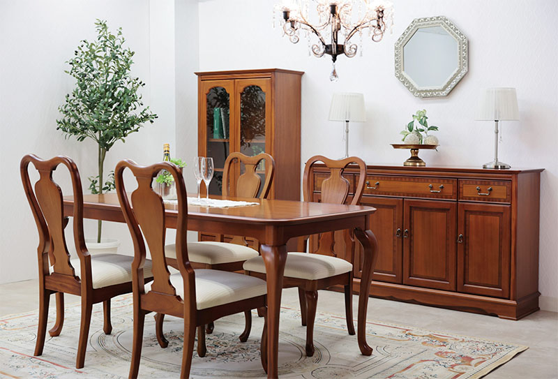 優雅でしなやかな曲線を活かした猫脚スタイルのダイニングセットと、職人の手作業による木目の模様貼りをアクセントにしたボード類とのハーモニーが、落ち着きのあるインテリアをご提案します。