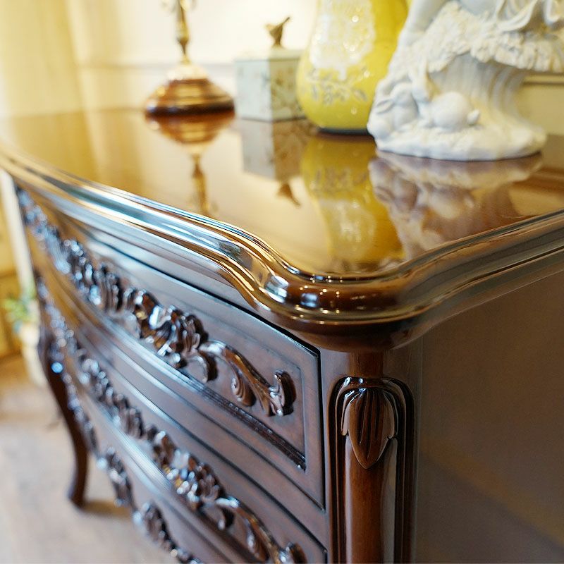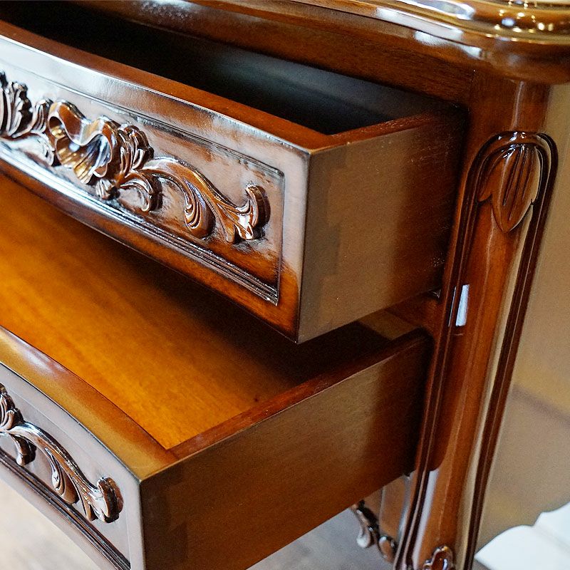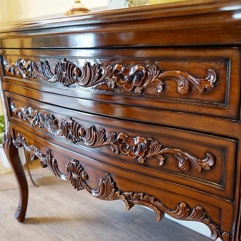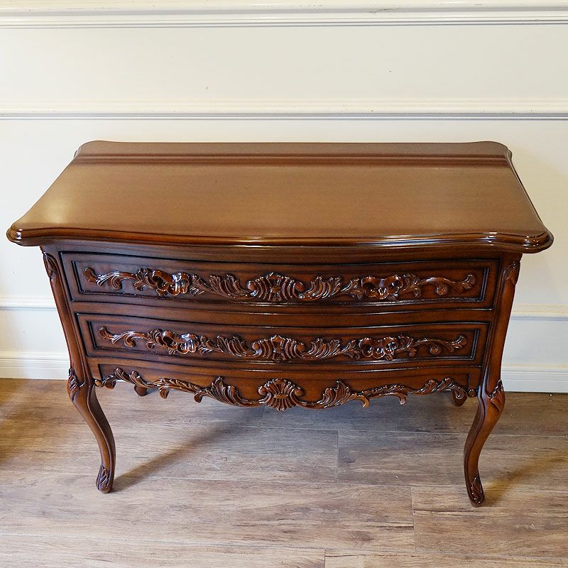 【コメント】フレンチクラシックスタイルの、美しいマホガニー材をふんだんに使用したワイド2段チェスト 収納家具です。前面を飾る木彫の美しさ&仕上げの美しさ、これほど美しいチェストはありません。猫脚が全体のイメージを柔らかく演出しています。