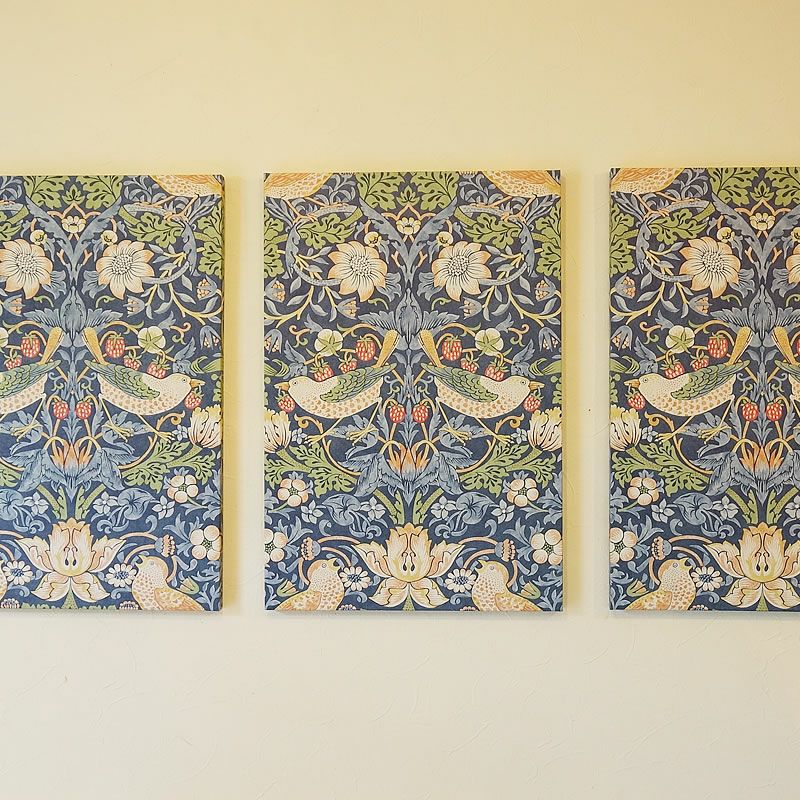 5. ウィリアムモリス アートパネル ロング版 3枚セット 壁紙使用「いちご泥棒 Strawberry thief」Morris 高級木製パネル使用(0702352×3)