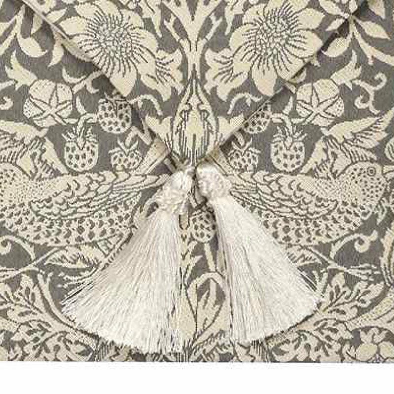 小鳥と花、苺という、前面に表出るされる図柄の後ろに、青い森が佇んでいるという、ウィリアムモリス独特のユートピアが感じられる作品。