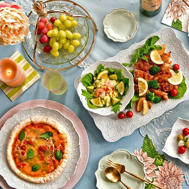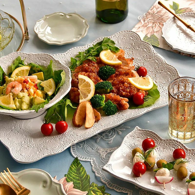 【コメント】上品なレースをモチーフとしたテーブルウェアは、特別なおもてなしやギフトに最適です。電子レンジ・食洗機・オーブンがご利用いただけます。すべてハンドメイドの為、色ムラ、黒点、気泡など、商品に個体差が生じる場合がございます。