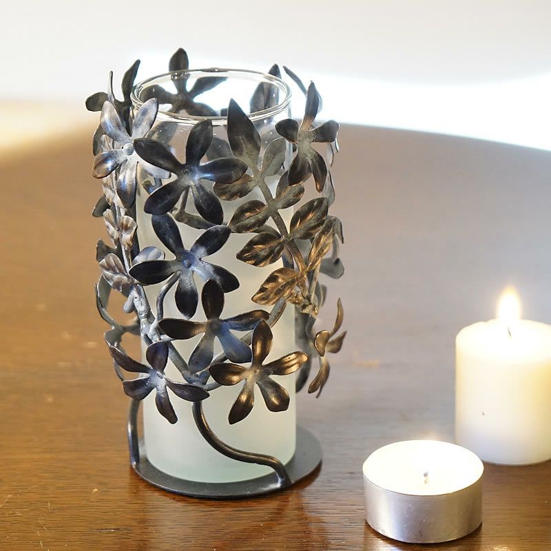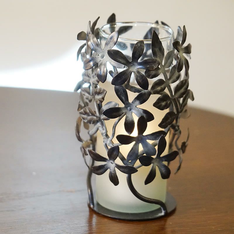 【コメント】ジャスミンの花をモチーフにしたアイアンの花瓶です。フレームはアイアンで花瓶はスモーク仕上げのガラスになります。スモークなので、キャンドルホルダーとしてもご利用いただけます。プレゼントにもおしゃれなアイテムです。