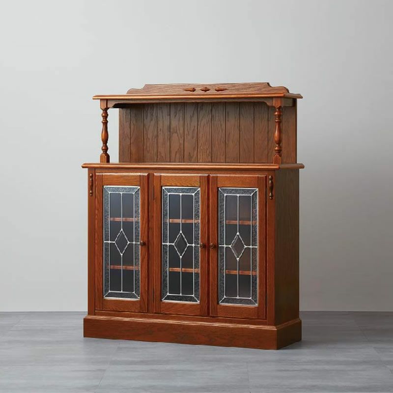 【コメント】上部に英国伝統のクラシカルな宮が付いた特徴的なサイドボードです。下段の扉が2枚戸~4枚戸の3タイプをご用意、関連製品よりお選びいただけます。宮には伝統的な挽物(ひきもの)細工など随所に細かい細工が施されています。扉はクリアガラス・木板戸から選択でき、貴重な装飾品であるステンドグラスにはバラのエッチング加工が施されています。圧迫感の少ない350mmの浅めの奥行で、飾り棚・本棚・食器棚としてご使用いただけます。引手は木製・金属製から、本体の仕上げは2色のカラーが選択でき、オプションで抗ウイルス・抗菌塗装加工もお選びいただけます。