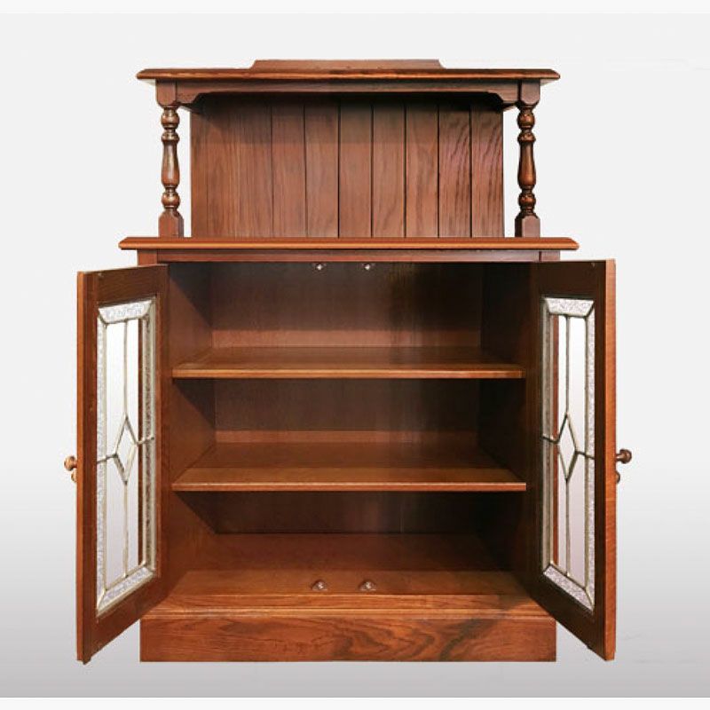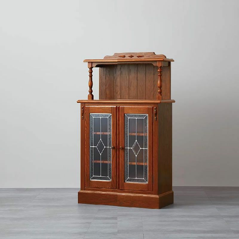 【コメント】上部に英国伝統のクラシカルな宮が付いた特徴的なサイドボードです。下段の扉が2枚戸~4枚戸の3タイプをご用意、関連製品よりお選びいただけます。宮には伝統的な挽物(ひきもの)細工など随所に細かい細工が施されています。扉はクリアガラス・木板戸から選択でき、貴重な装飾品であるステンドグラスにはバラのエッチング加工が施されています。圧迫感の少ない350mmの浅めの奥行で、飾り棚・本棚・食器棚としてご使用いただけます。引手は木製・金属製から、本体の仕上げは2色のカラーが選択でき、オプションで抗ウイルス・抗菌塗装加工もお選びいただけます。