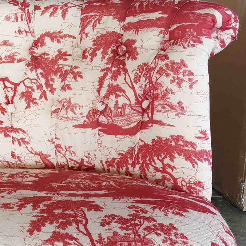 【コメント】エレガントなフランスのトワルドジュイ レッド柄を張ったちょっと小さめの2人掛けソファです。マンションにぴったりのサイズです!また、リビングやベッドルームのアクセントチェアにもなります。ロマンチックなフレンチスタイルのソファです。