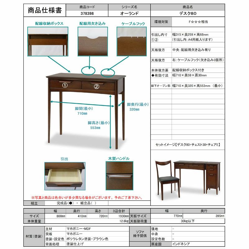 ミッドセンチュリースタイル家具| オーランド デスク 引き出し 80 木製 平机 おしゃれ マホガニー 開梱設置込み ミッドセンチュリー家具