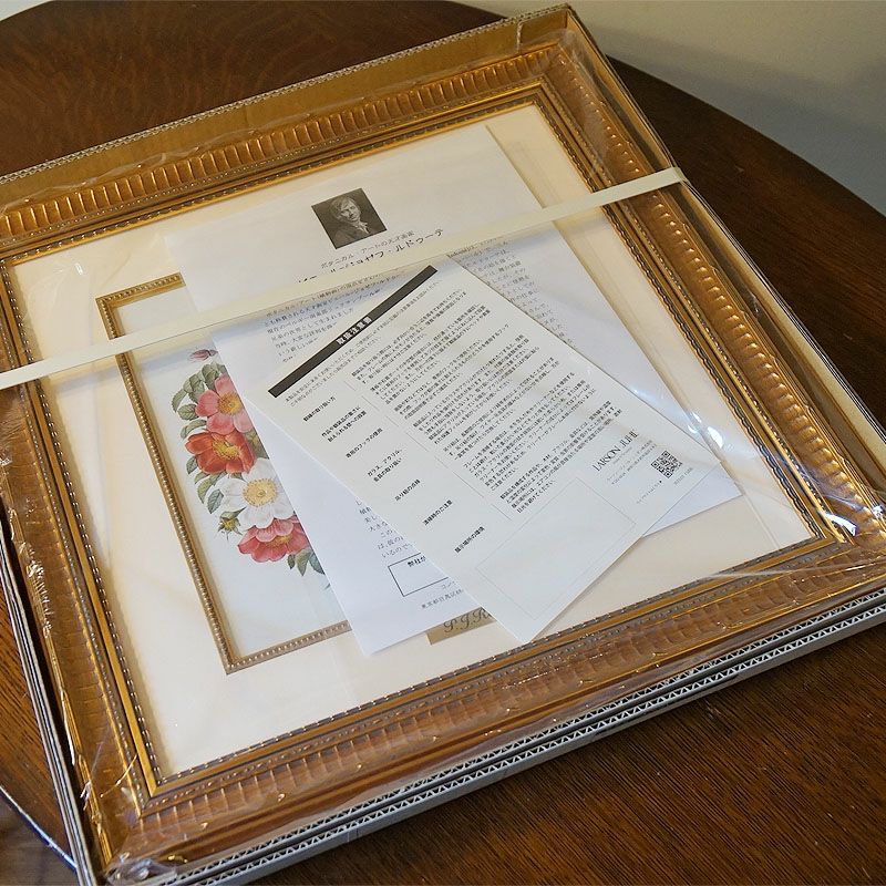 南ネーデルラント出身のベルギーの画家、植物学者。 ユリやバラなどの植物を描いた博物画を多く残しており、「バラの画家」「花の画家」として知られる。 銅版画による多色刷り印刷を確立した人物と言われる場合もあるが、彼の作品はすべて手彩色による修正が施されている。ルドゥーテはいくつかの植物図譜を著すが、その中でも「バラ図譜(Les Roses)」は最高傑作と言われる。アンティーク調の木の風合いにゴールドの塗装を重ねた高級感あふれる枠が「バラの画家」ルドゥーテの博物画をいっそう引き立てています。