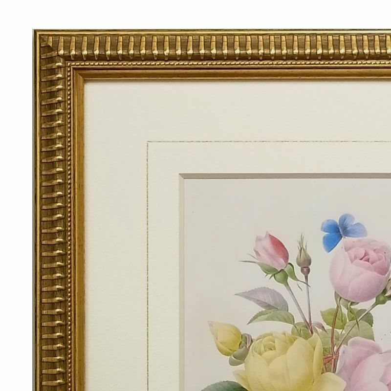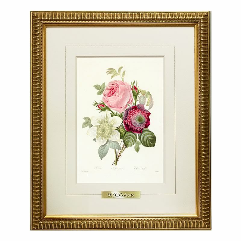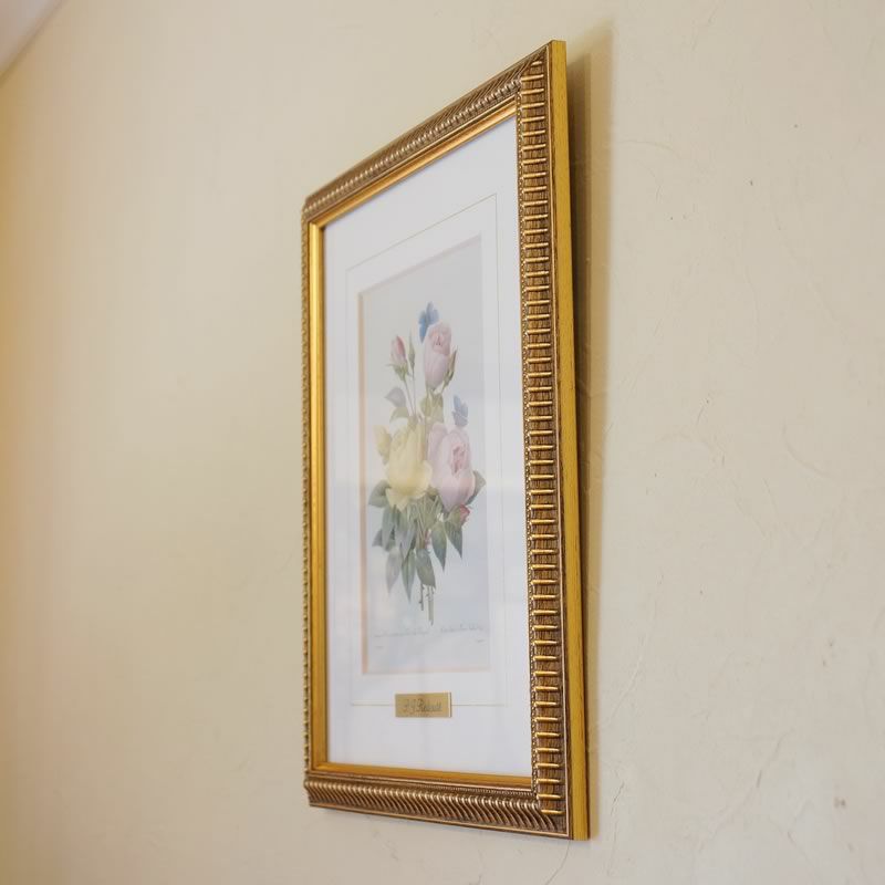 【コメント】南ネーデルラント出身のベルギーの画家、植物学者。 ユリやバラなどの植物を描いた博物画を多く残しており、「バラの画家」「花の画家」として知られる。 銅版画による多色刷り印刷を確立した人物と言われる場合もあるが、彼の作品はすべて手彩色による修正が施されている。ルドゥーテはいくつかの植物図譜を著すが、その中でも「バラ図譜(Les Roses)」は最高傑作と言われる。アンティーク調の木の風合いとゴールドのライン塗装が入った高級感あふれる枠が「バラの画家」ルドゥーテの博物画をいっそう引き立てています。ゴールドフレームに美花選&バラ図譜の縮小版が、4種類で登場しました。オリジナル版(フォリオ判原寸大)の縮小版ですので、飾るところを選ばず、玄関先やトイレ・洗面室など空間を華やかにしたい場所にぴったりです。日本で生産しておりますので、プリントの技術・マットはきれいで、真鍮のルドゥーテプレートも付いています。新築祝いなどのプレゼントにも喜ばれます。
