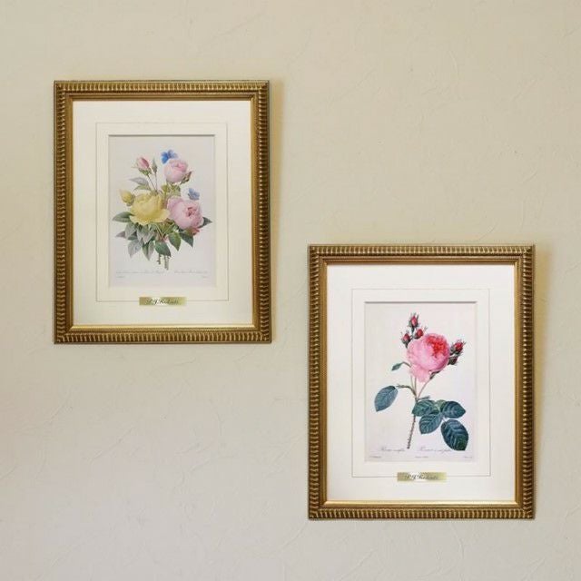 【コメント】南ネーデルラント出身のベルギーの画家、植物学者。 ユリやバラなどの植物を描いた博物画を多く残しており、「バラの画家」「花の画家」として知られる。 銅版画による多色刷り印刷を確立した人物と言われる場合もあるが、彼の作品はすべて手彩色による修正が施されている。ルドゥーテはいくつかの植物図譜を著すが、その中でも「バラ図譜(Les Roses)」は最高傑作と言われる。アンティーク調の木の風合いとゴールドのライン塗装が入った高級感あふれる枠が「バラの画家」ルドゥーテの博物画をいっそう引き立てています。ゴールドフレームに美花選&バラ図譜の縮小版が、4種類で登場しました。オリジナル版(フォリオ判原寸大)の縮小版ですので、飾るところを選ばず、玄関先やトイレ・洗面室など空間を華やかにしたい場所にぴったりです。日本で生産しておりますので、プリントの技術・マットはきれいで、真鍮のルドゥーテプレートも付いています。新築祝いなどのプレゼントにも喜ばれます。