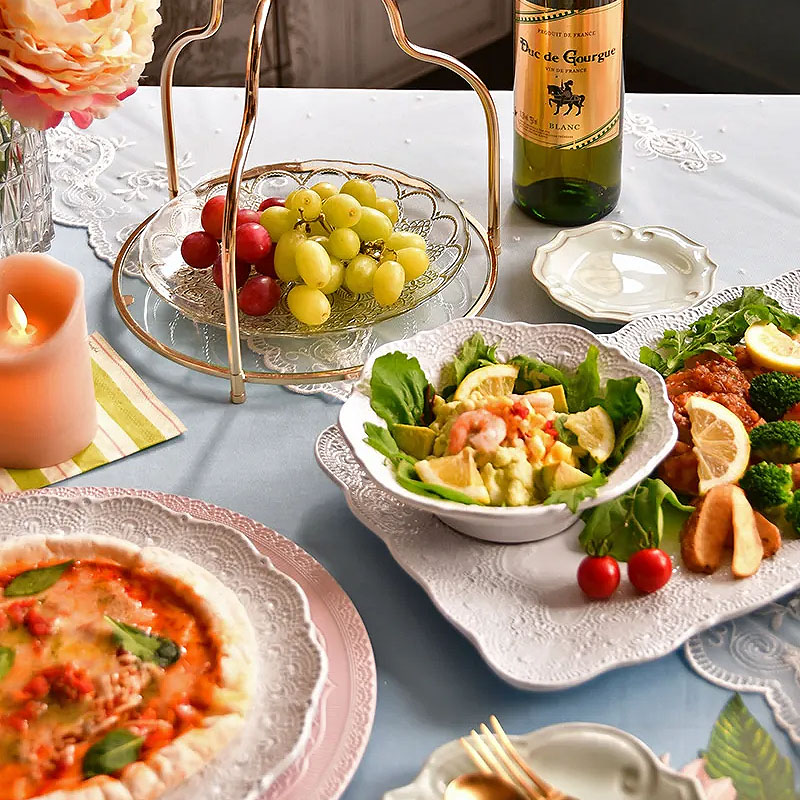 【コメント】上品なレースをモチーフとしたテーブルウェアは、特別なおもてなしやギフトに最適です。電子レンジ・食洗機・オーブンがご利用いただけます。すべてハンドメイドの為、色ムラ、黒点、気泡など、商品に個体差が生じる場合がございます。