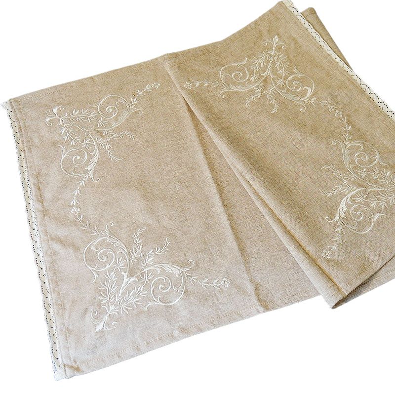 【コメント】シンプルデザインのテーブルランナーです。アクセントに両端にホワイトで刺繍を施していておしゃれです。優しい感じのナチュラル感がある素材ですからどんなダイニングテーブルにもよく似合います。
