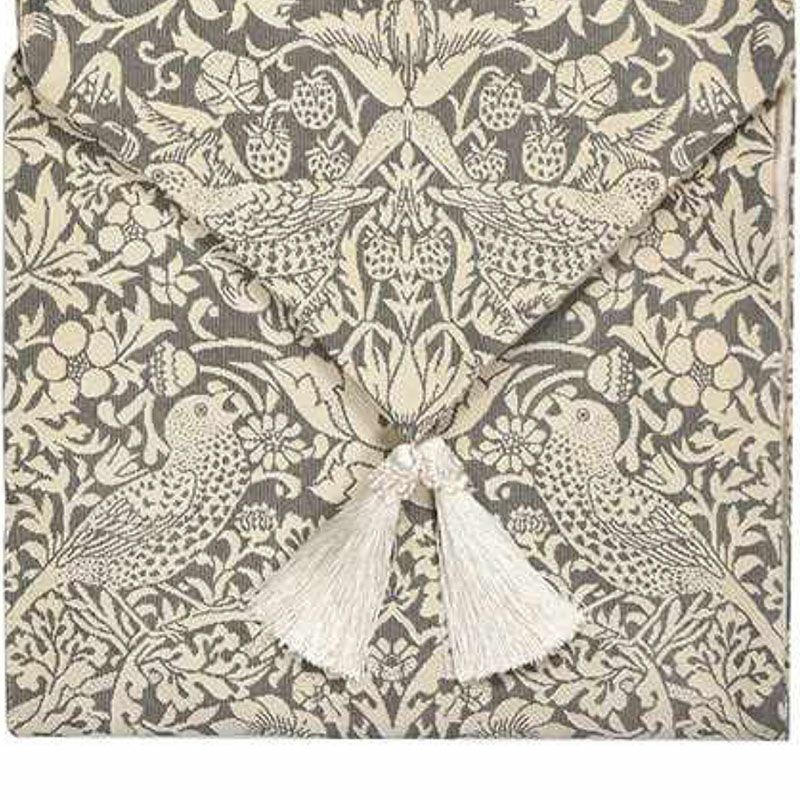 小鳥と花、苺という、前面に表出るされる図柄の後ろに、青い森が佇んでいるという、ウィリアムモリス独特のユートピアが感じられる作品。